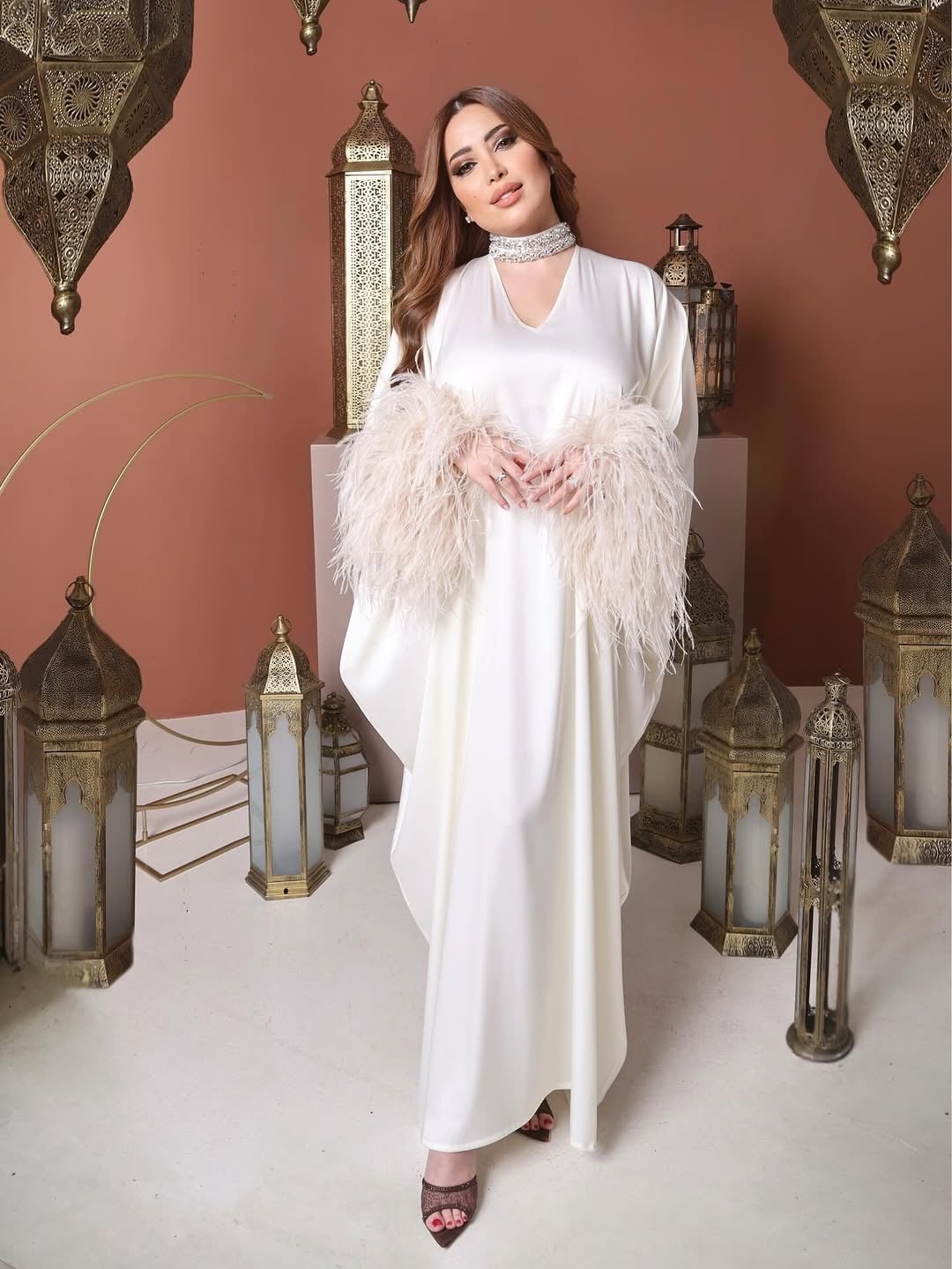 تألقت الفنانة السورية بعباءة طويلة من الساتان اللامع باللون الأبيض بتصميم فضفاض ومن دون تطريزات، وجاءت بفتحة V ناعمة وبأكمام مزينة بالريش الأبيض، والتقطت الصور وهي تحمل الفوانيس، في إطلالة تناسب أجواء الشهر الفضيل.