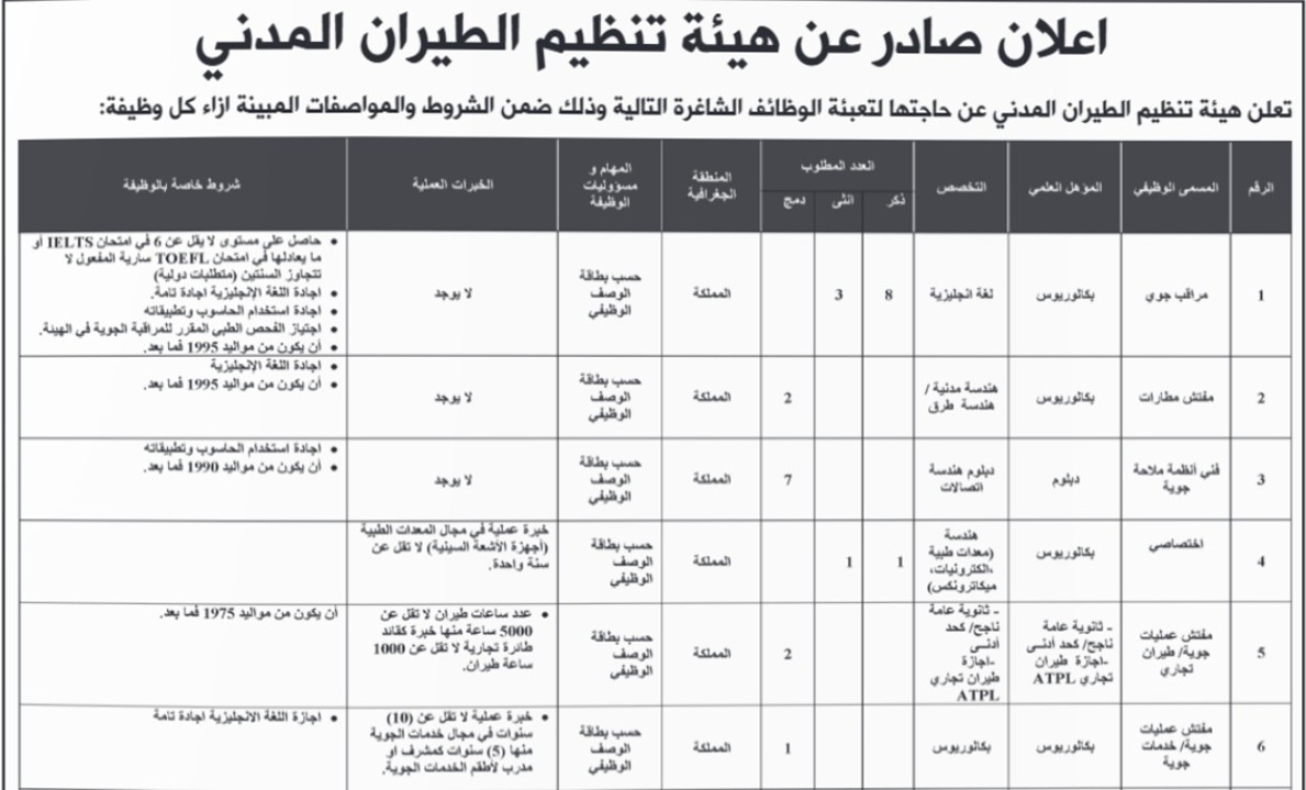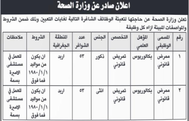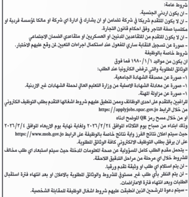 أعلنت مؤسسات ودوائر حكومية، اليوم الاثنين، عن حاجتها لتعبئة عدد من الوظائف الشاغرة، وذلك ضمن الشروط والمواصفات المحددة إزاء كل وظيفة، بحسب الجدول المرفق.