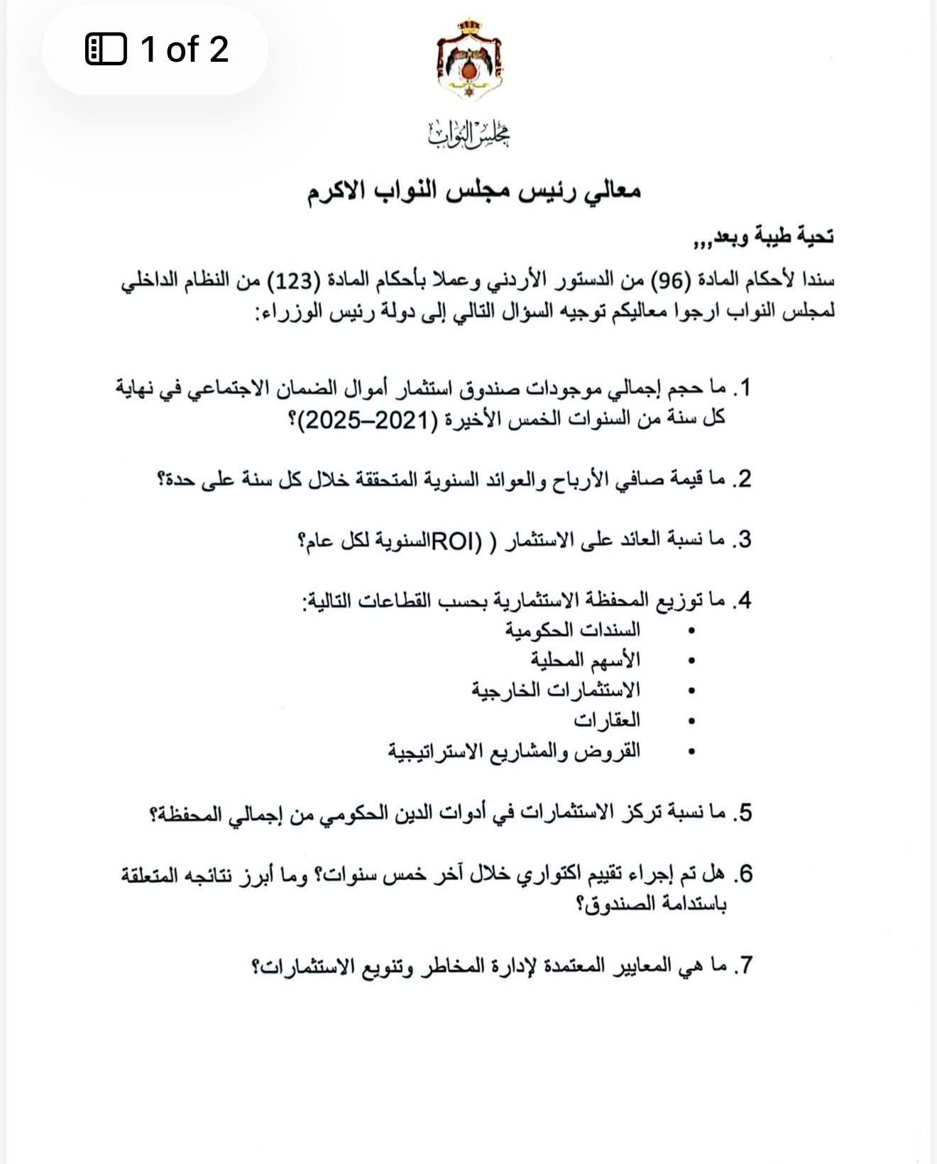 رم - وجهت النائب ديمة طهبوب 14 سؤالا نيابيا لرئيس مجلس الوزراء وذلك إثر مقابلة مدير عام مؤسسة الضمان وفيما يلي نص السؤال؛