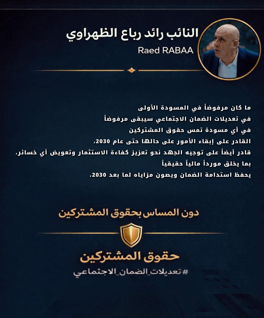 وأضاف في تعليق له، أن ما كان مرفوضًا في المسودة الأولى من مشروع قانون الضمان الاجتماعي سيبقى مرفوضًا في أي صيغة جديدة إذا تضمّن مساسًا بالحقوق التعاقدية المستقرة للمشتركين.