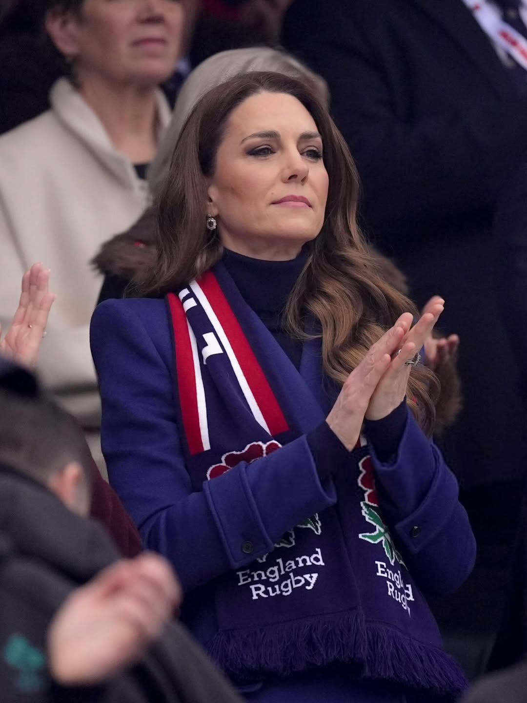 اعتمدت ميدلتون إطلالة بسيطة وأنيقة في ظهورها المنفرد، متخليةً بهدوء عن قاعدة أزياء راسخة: عدم تنسيق الأسود مع الكحلي. بالطبع، وُضعت هذه القواعد لتُكسر، وإطلالتها الأنيقة والبسيطة خير دليل على ذلك. ارتدت معطفًا صوفيًا كحليًا بأكمام محددة وخصر ضيق قليلاً، مع كنزة سوداء برقبة عالية. وأكملت إطلالتها بتشجيع فريقها بوشاح الرغبي الإنجليزي. في هذه الأثناء، تألقت بزوج من الأقراط الماسية المتدلية البراقة.