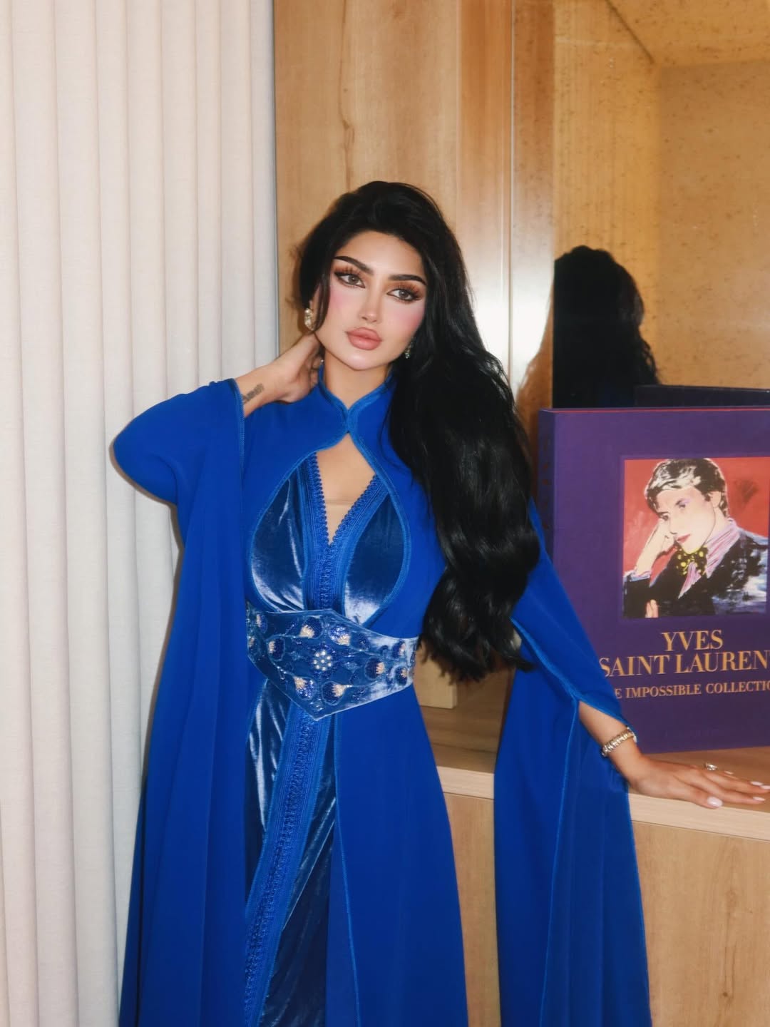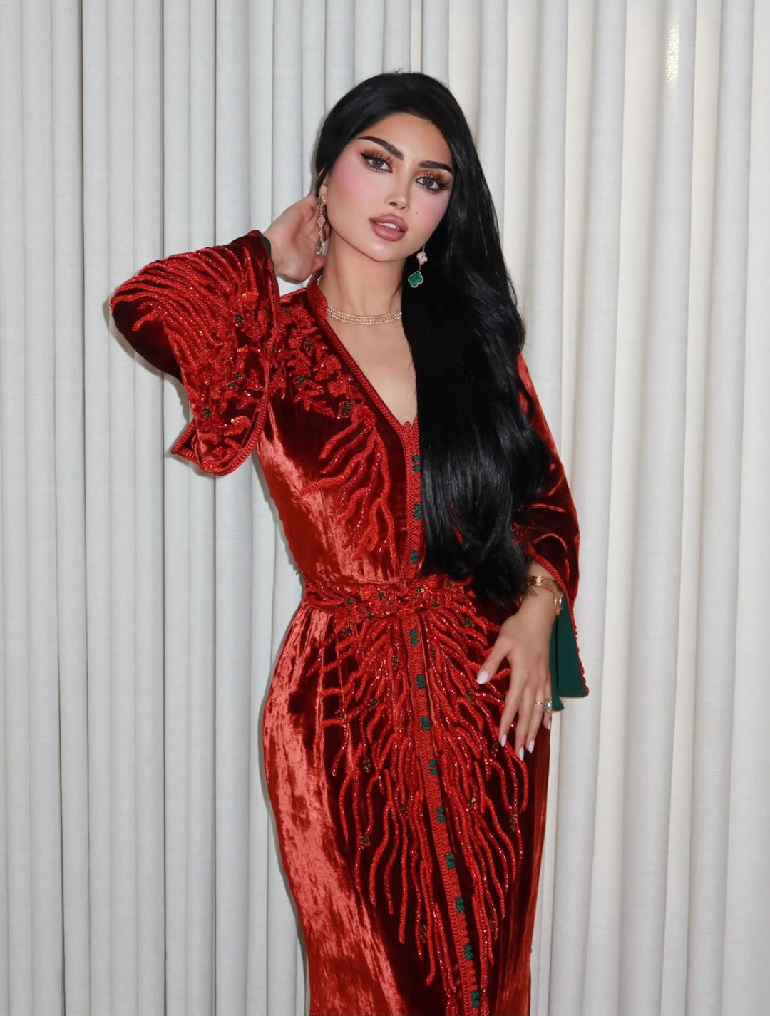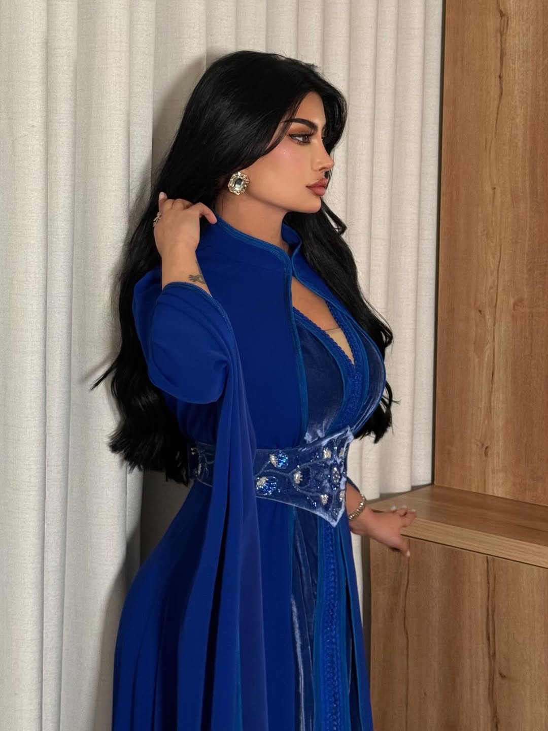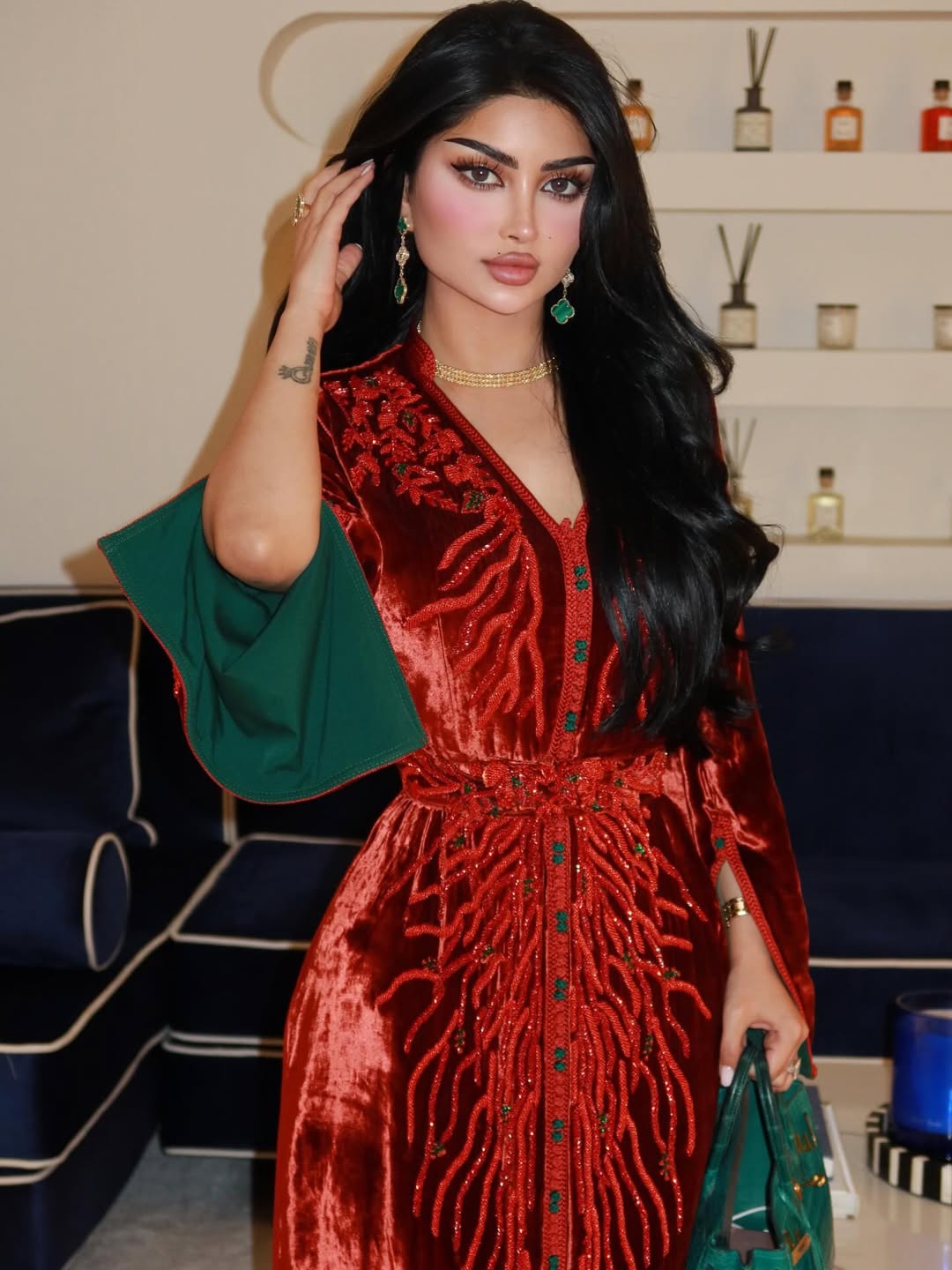 اختارت كابلي بتنسيقها الأول القفطان باللون الأزرق الملكي بحزام مزركرش عند منطقة الخصر٬ وفي تنسيق آخر ارتدت جلابية تجمع اللونين الفاقعين البرتقالي والأخضر بتطريزات بارزة بينما اعتمدت بإطلالتها الثالثة جلابية سوداء أنثوية منقوشة بالورود الملونة