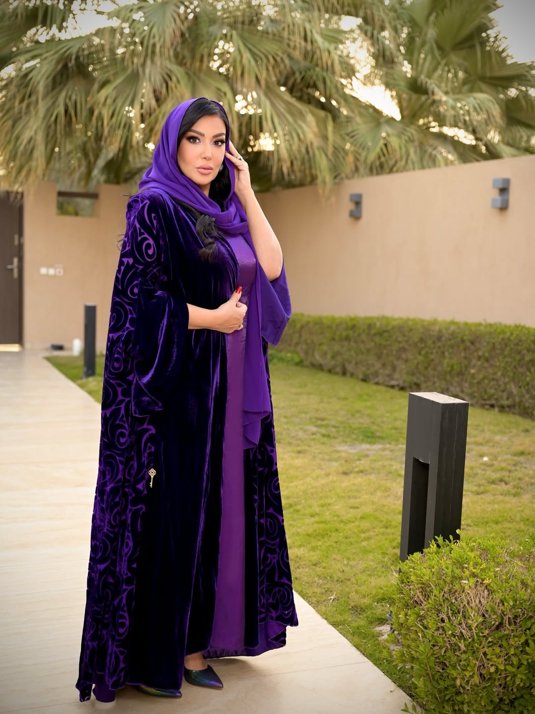 اختارت تصميما مميزا بعباءة ثقيلة بنقوش بارزة ونسقت تحتها فستانا منسدلا بدرجة أفتح من اللون البنفسجي ووضعت شالاً على رأسها من الشيفون الناعم.