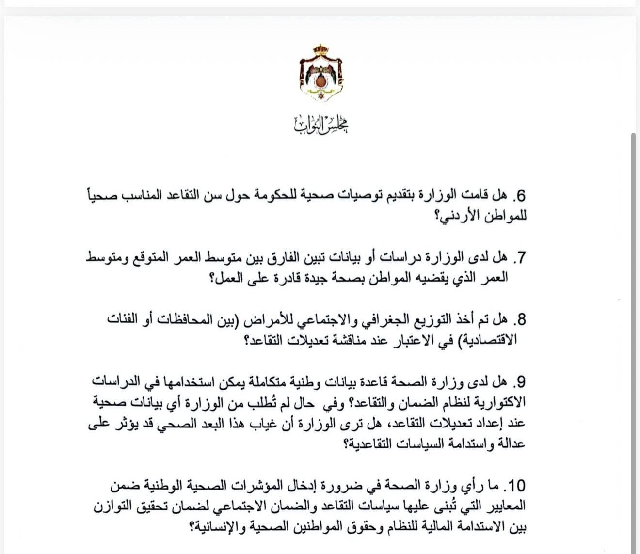 ٦. هل قامت الوزارة بتقديم توصيات صحية للحكومة حول سن التقاعد المناسب صحياً للمواطن الأردني؟