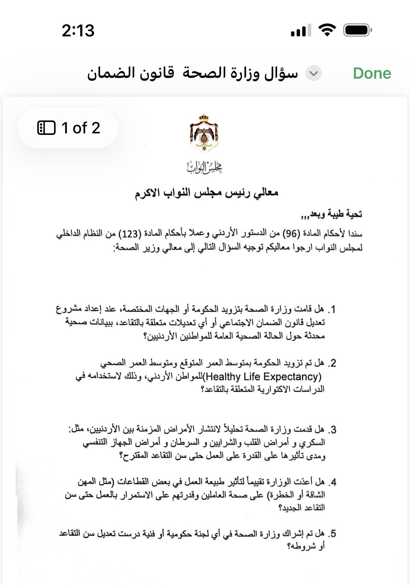 ١. هل قامت وزارة الصحة بتزويد الحكومة أو الجهات المختصة، عند إعداد مشروع تعديل قانون الضمان الاجتماعي أو أي تعديلات متعلقة بالتقاعد، ببيانات صحية محدثة حول الحالة الصحية العامة للمواطنين الأردنيين؟