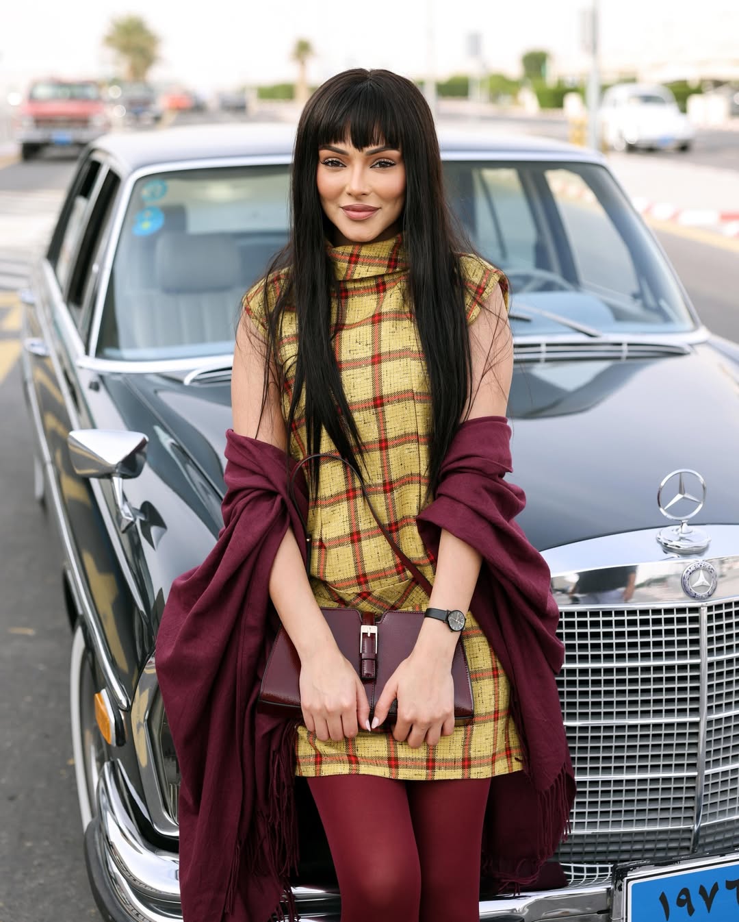 اختيارات شوق للملابس الملونة اقتصرت على نقشات كلاسيكية من تلك الحقبة كالكاروهات والفساتين القصيرة الواسعة والتنانير الميدي المستقيمة.