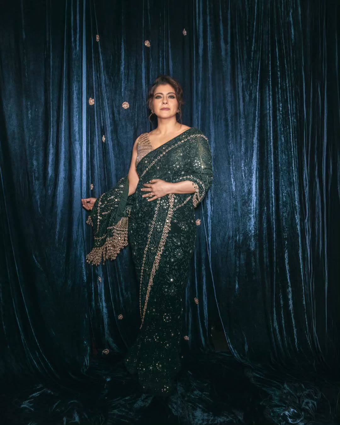 رم - ظهرت نجمة بوليوود كاجول ديفجان في أحدث جلسة تصوير بساري هندي باللون الأخضر الداكن، وأضفت الخيوط الذهبية اللامعة التي زينت التصميم لمسة من الفخامة والجاذبية؛ مما جعل الإطلالة تجمع بين الأصالة والبريق الراقي.