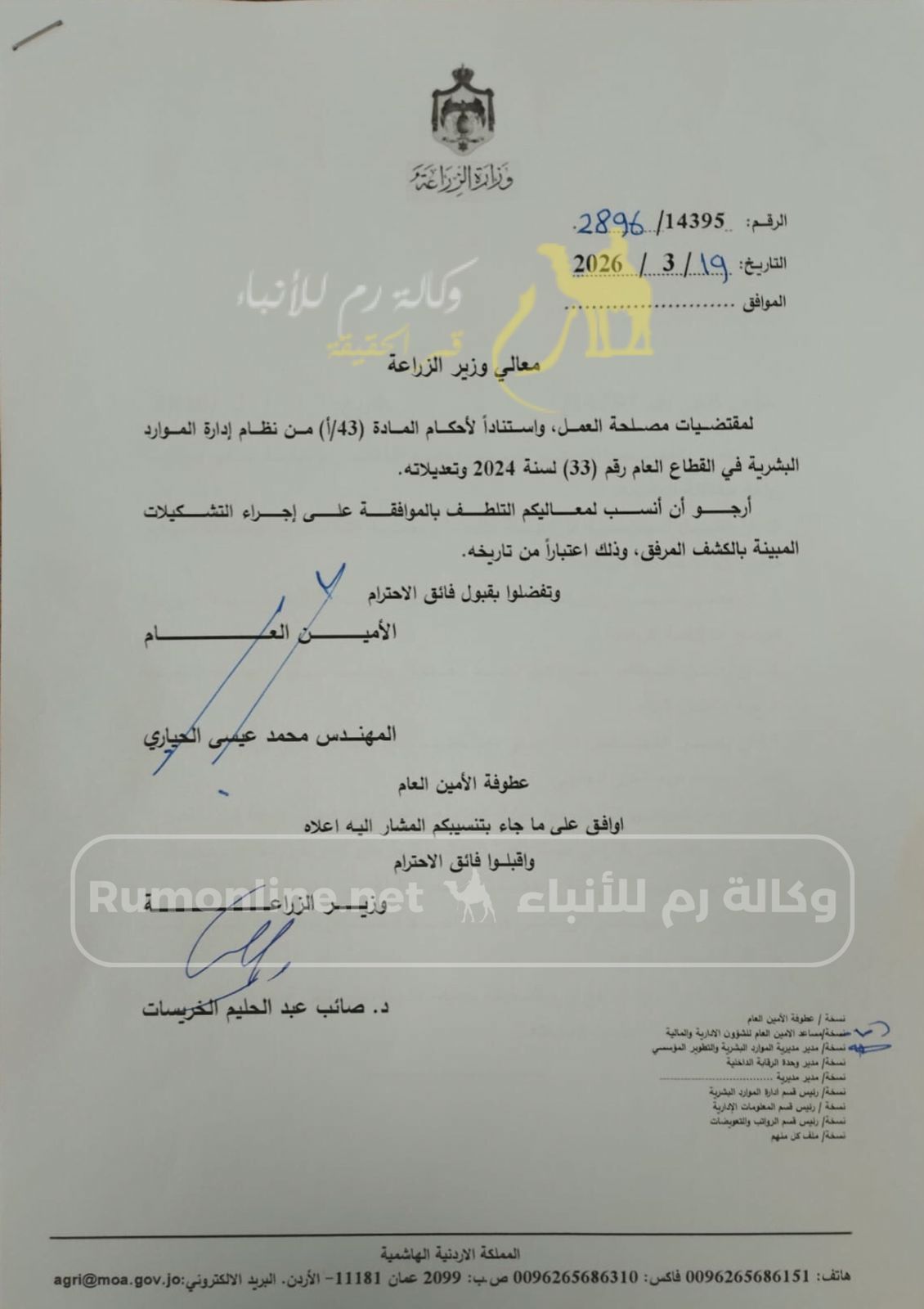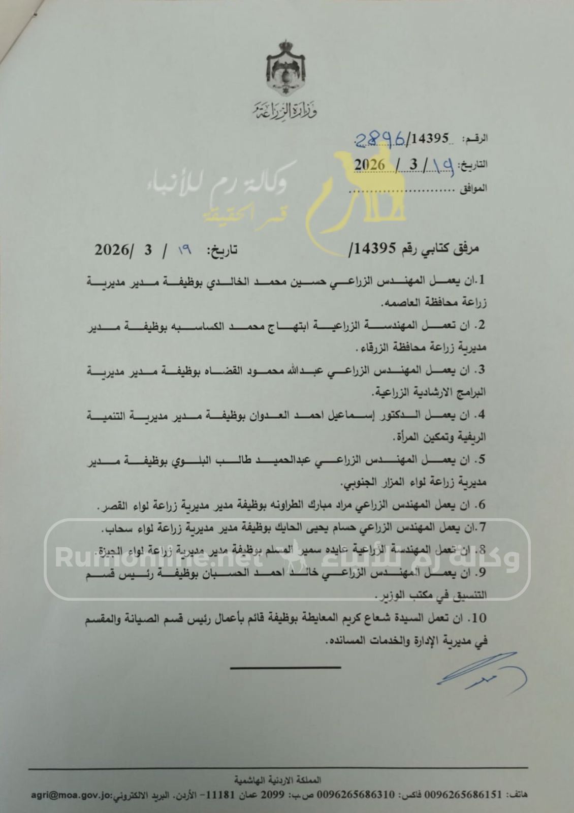 رم - أجرى وزير الزراعة الدكتور صائب خريسات اليوم الخميس 29 رمضان 2026، تشكيلات شملت 10 وظائف إدارية "مدراء مديرية و رؤساء أقسام" و شملت التشكيلات الأسماء التالية : -
