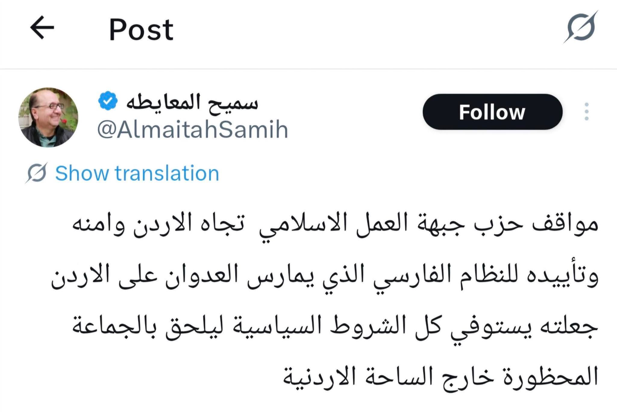 تحدي فريحات جاء ردا على منشور للمعايطة على موقع x قال فيها : (( مواقف حزب جبهة العمل الاسلامي تجاه الاردن وامنه وتأييده للنظام الفارسي الذي يمارس العدوان على الاردن جعلته يستوفي كل الشروط السياسية ليلحق بالجماعة المحظورة خارج الساحة الاردنية))