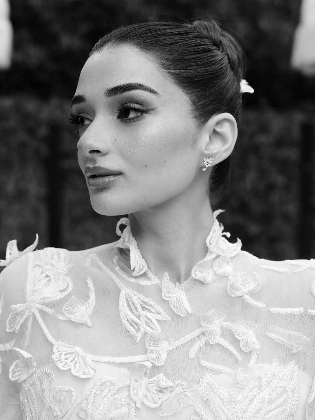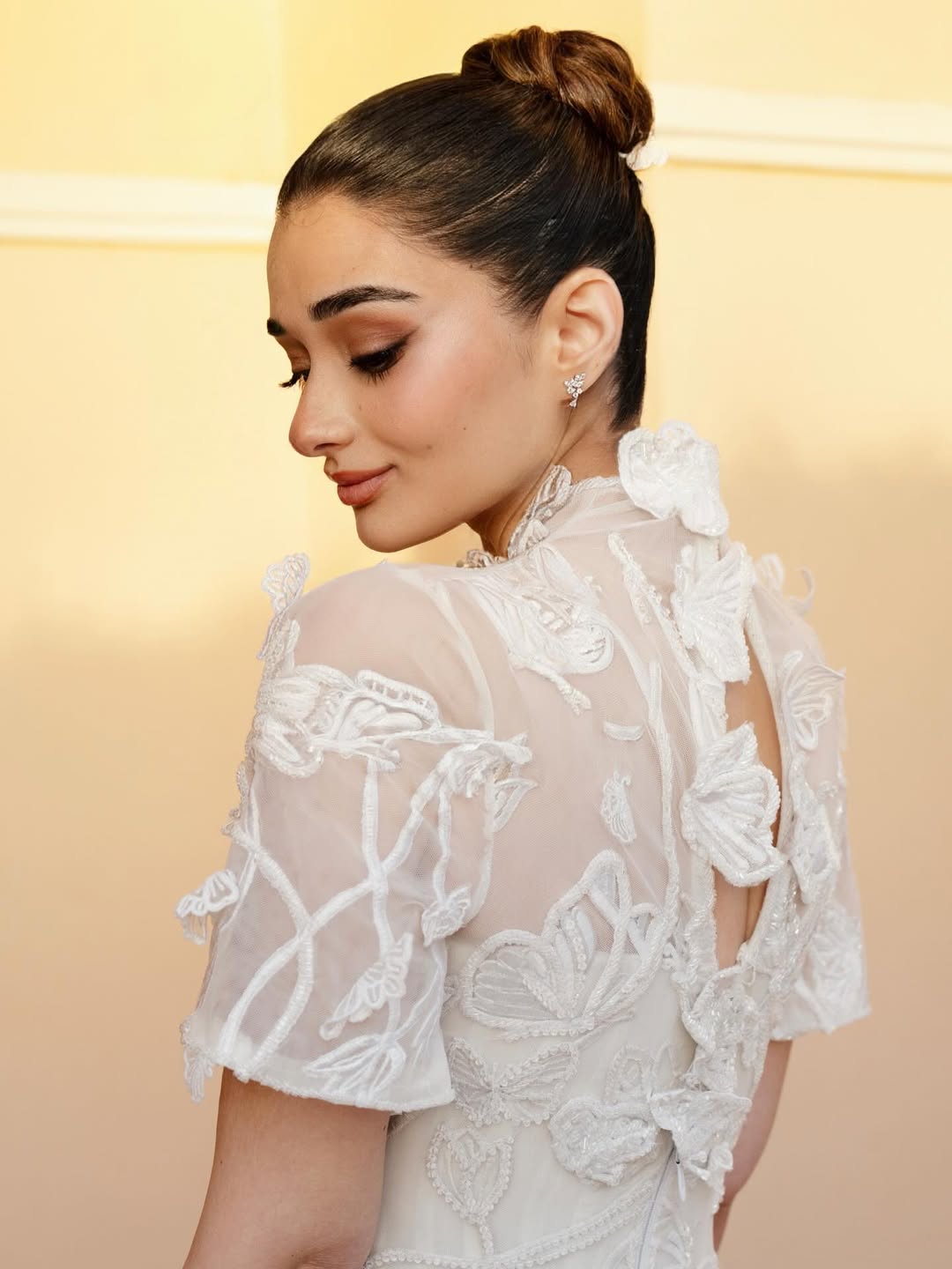 نسقت ملك مع فستانها الحالم تسريحة شعر مرفرعة تناسبت مع قصة الرقبة العالية للتصميم، فيما توجهت للمكياج المطفي بتدرجات النيود الترابية بأنامل خبيرة المكياج #ريهام_خليفة.