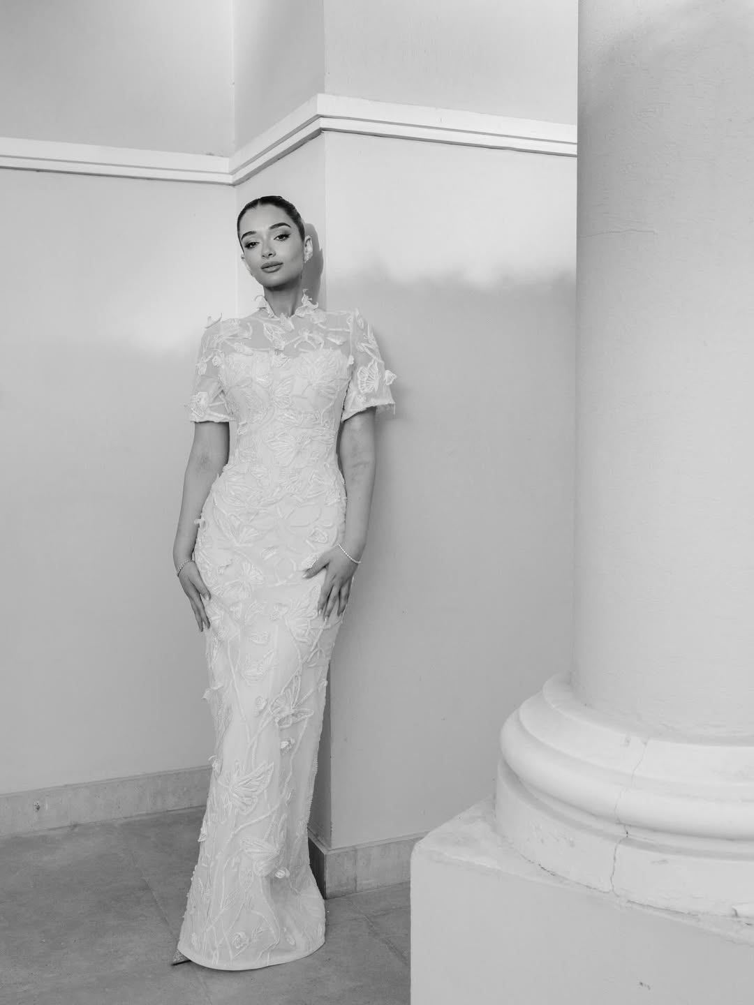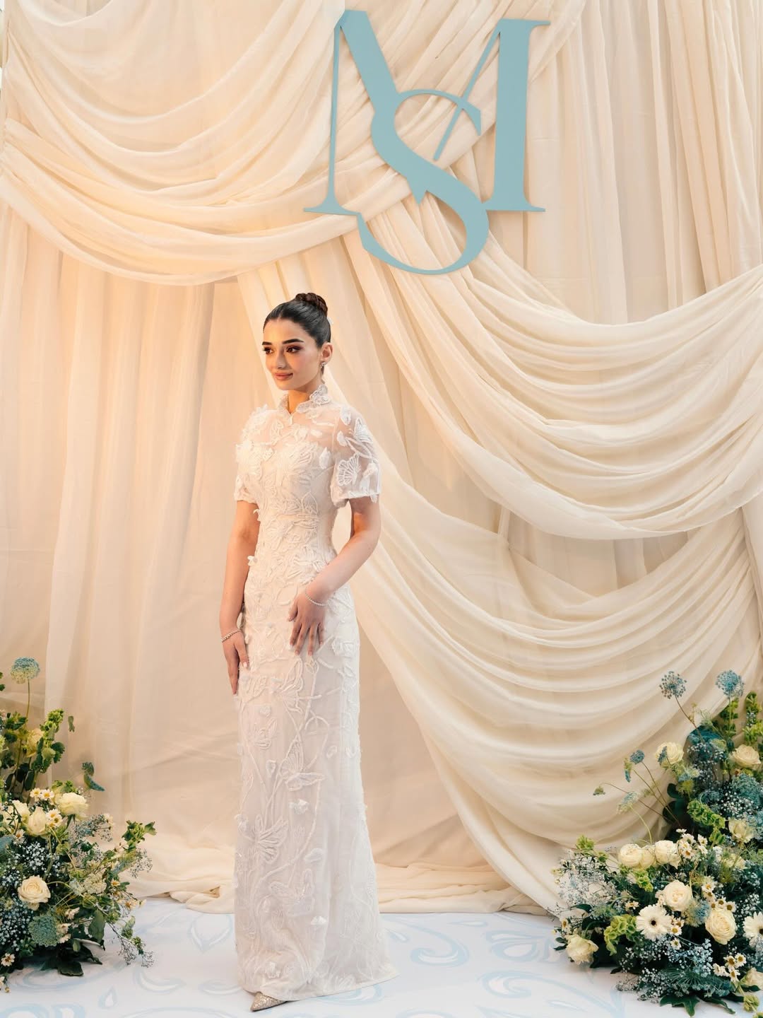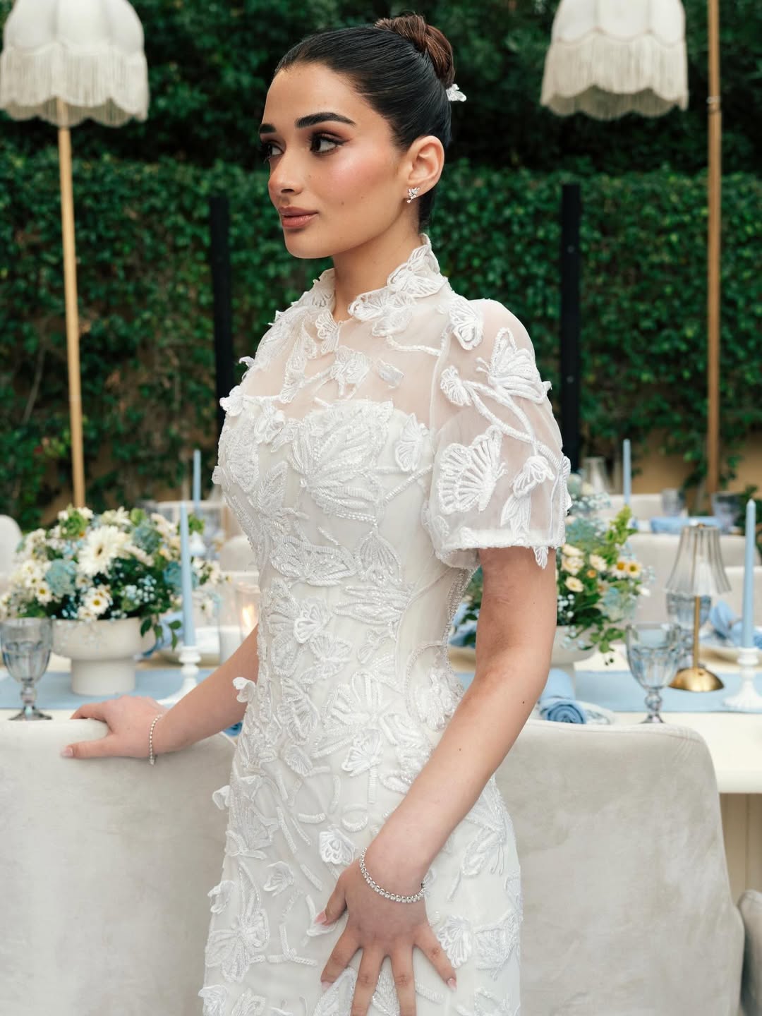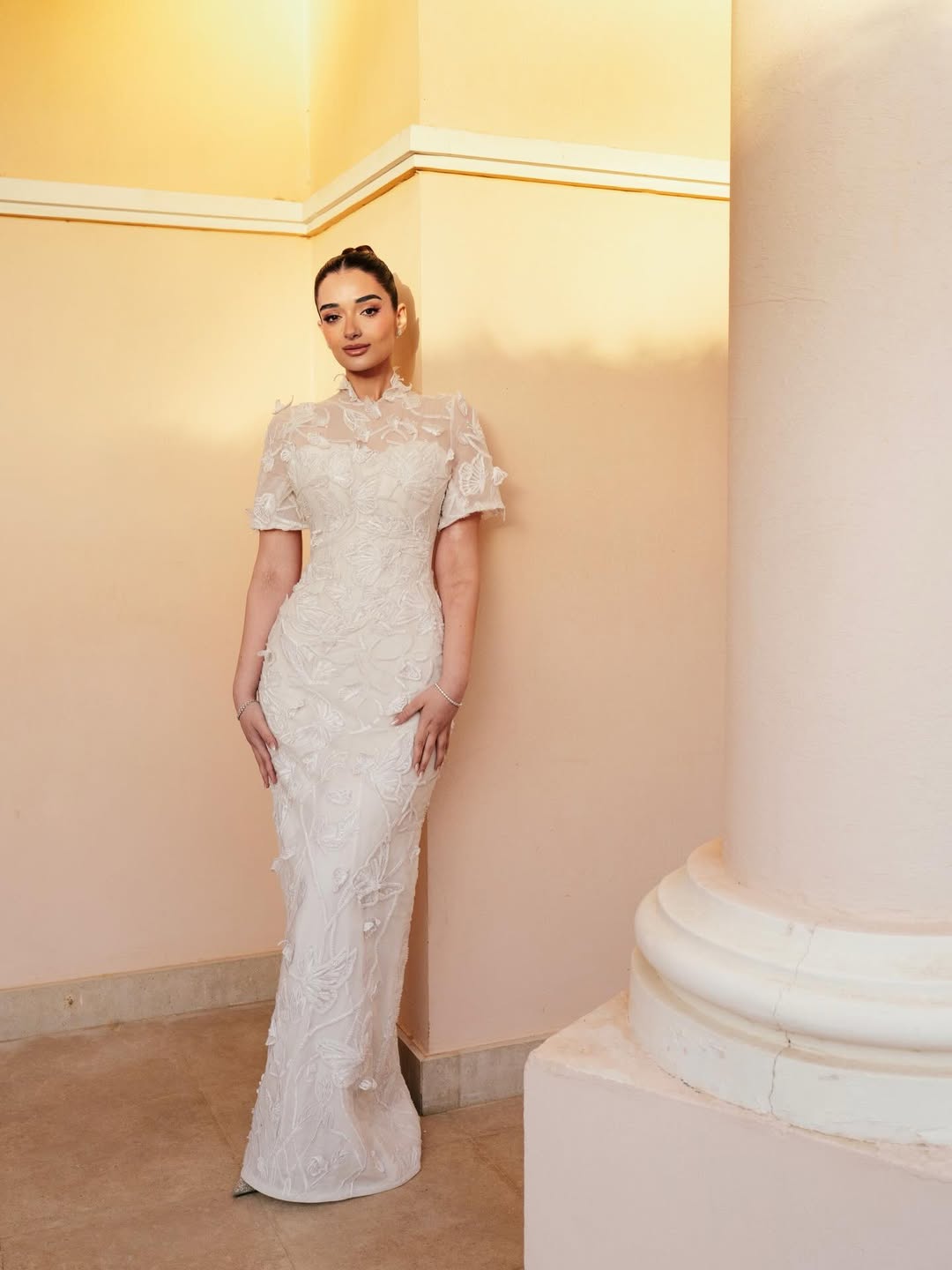 رم - شاركت النجمة المصرية #ملك_أحمد_زاهر عبر حسابها في "إنستغرام" جلسة تصوير مميزة لها من حفل خطوبتها تستعرض خلالها التصميم الفخم الذي اختارته لهذه المناسبة؛ إذ تميز بقماش الشيفون الناعم والمنقش بأشكال الورود والفراشات باللون الأبيض الراقي من توقيع L’ATELIER DE MIA.