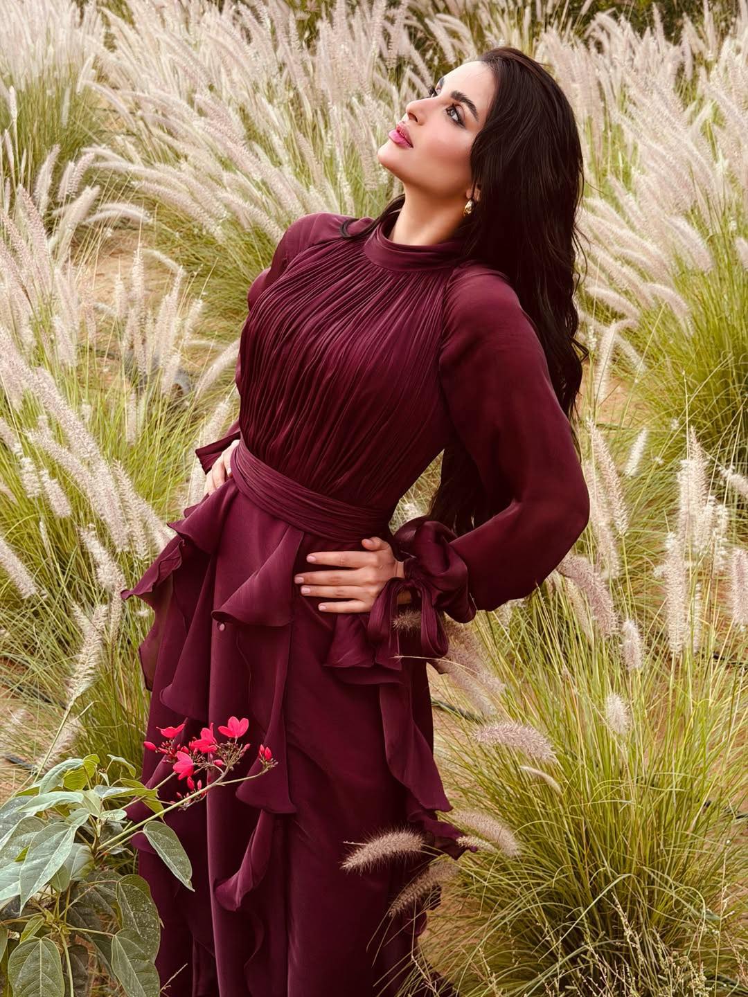 مس دعاء بفستان برغندي ساحر وسط الحقول