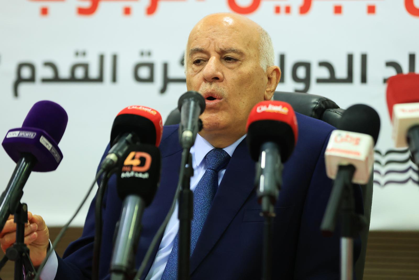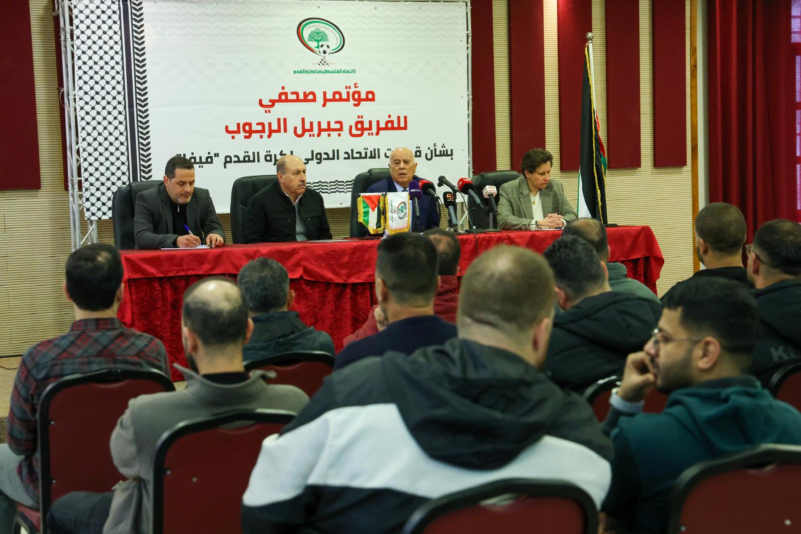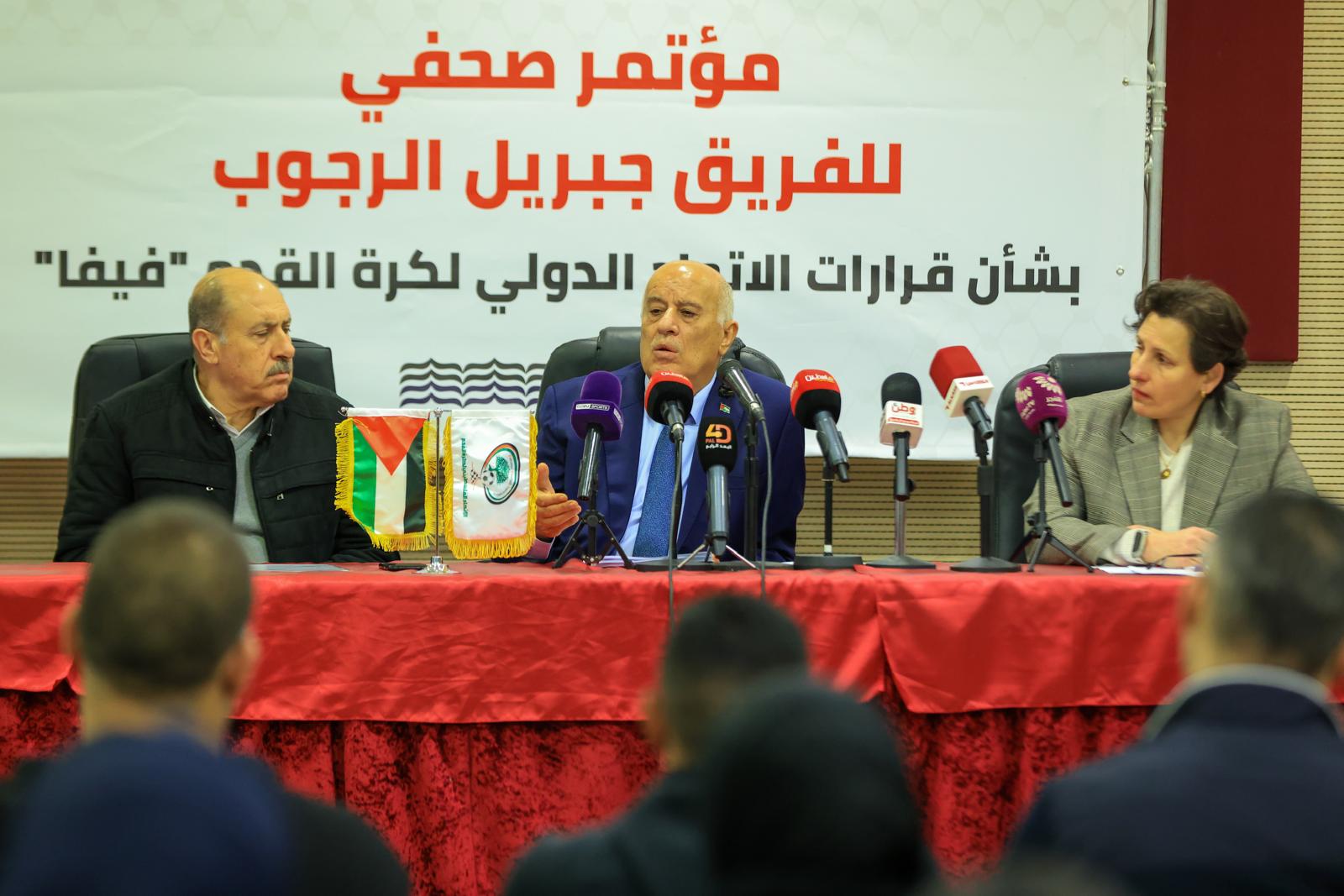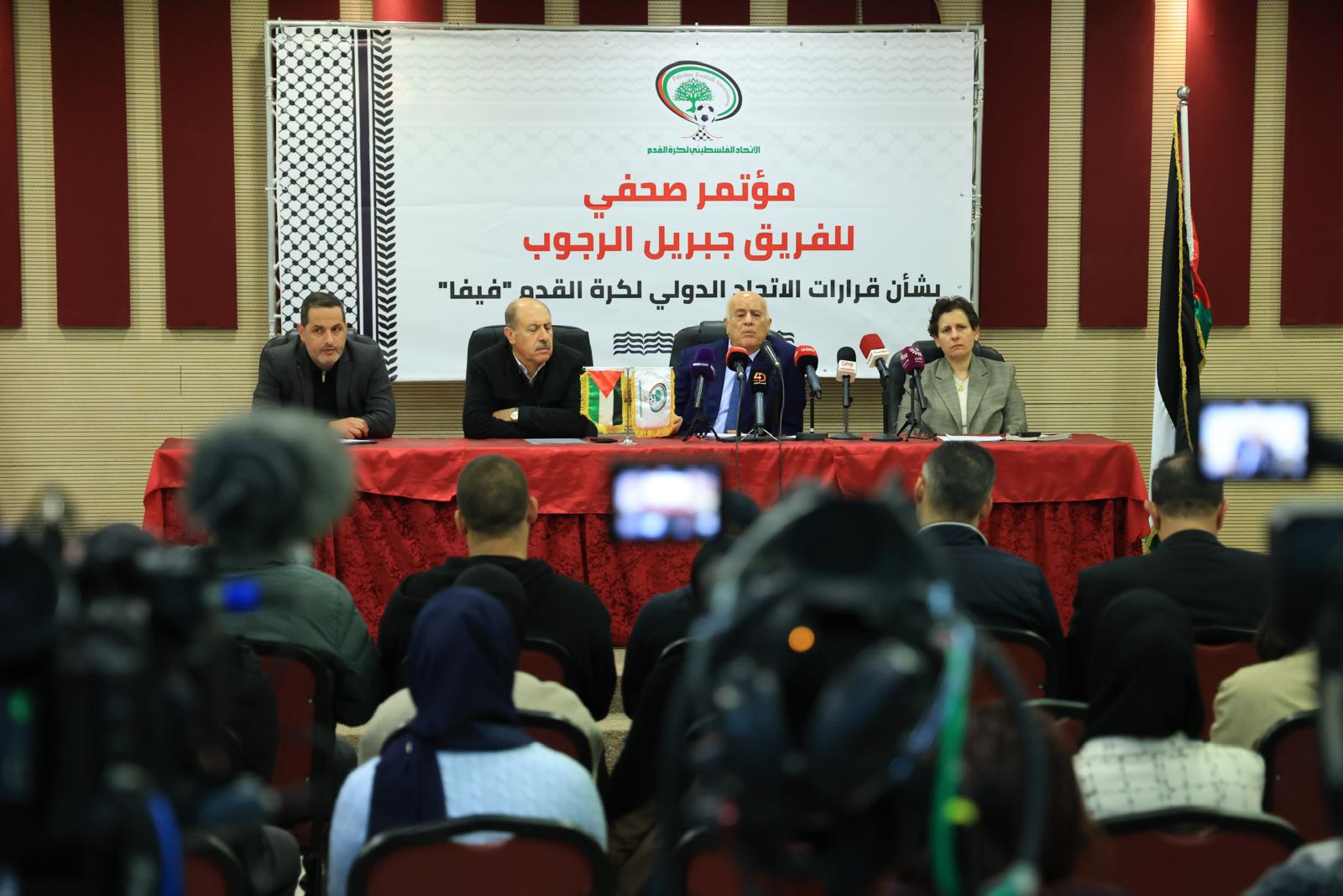 عقد الفريق جبريل الرجوب، رئيس الاتحاد الفلسطيني لكرة القدم، اليوم الثلاثاء، مؤتمراً صحفياً تناول فيه آخر تطورات التحركات الفلسطينية والقرارات الأخيرة للاتحاد الدولي لكرة القدم "فيفا" بشأن الانتهاكات الإسرائيلية بحق الرياضة الفلسطينية، مؤكداً استمرار العمل القانوني والدولي حتى تحقيق العدالة.
