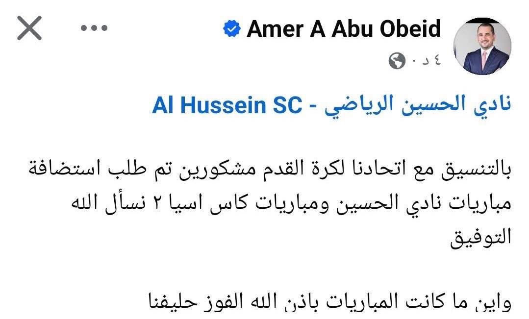 كشف رئيس نادي الحسين، عامر أبو عبيد، عبر صفحته الشخصية، عن تقديم طلب رسمي بالتنسيق مع الاتحاد الأردني لكرة القدم، لاستضافة مباريات نادي الحسين ضمن منافسات بطولة كأس آسيا 2.