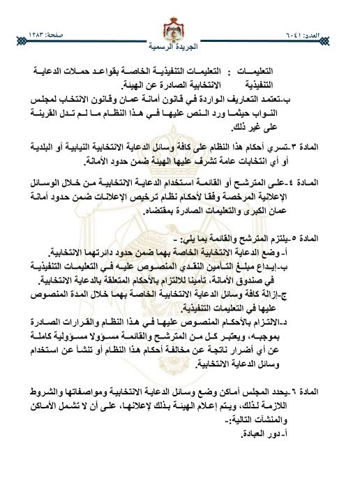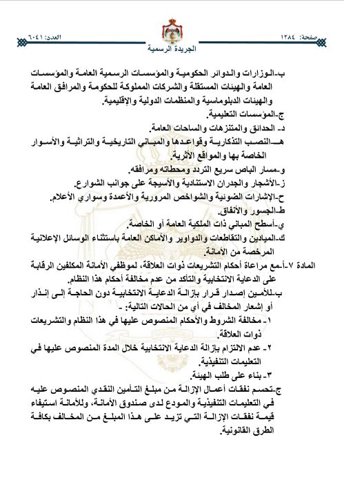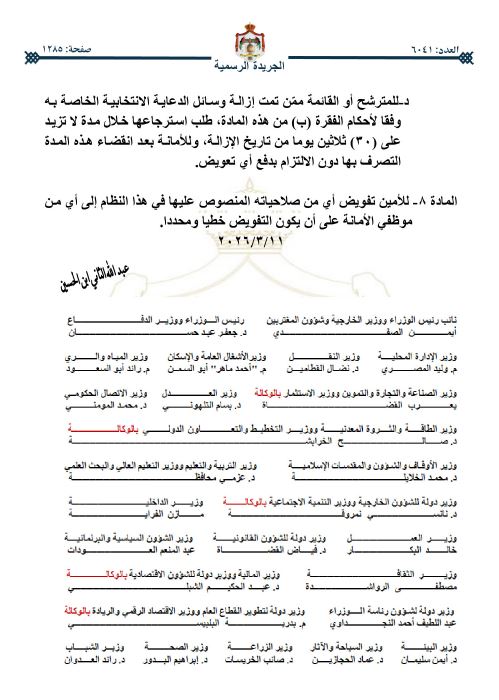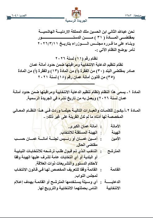رم - صدرت الإرادة الملكية السامية، في عدد الجريدة الرسمية اليوم الخميس بالموافقة على قرار مجلس الوزراء الصادر بتاريخ 11-3-2026، المتضمن وضع نظام تنظيم الدعاية الانتخابية، ومراقبتها ضمن حدود أمانة عمَّان.