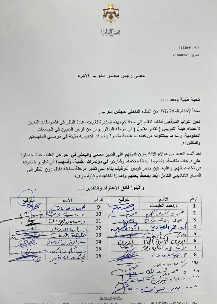 رم - تبنّى النائب الدكتور أحمد العليمات مذكرة نيابية تطالب بإعادة النظر في شروط التعيين لأعضاء الهيئة التدريسية في الجامعات الحكومية، والتي تُبنى على تقدير مرحلة البكالوريوس(مقبول).