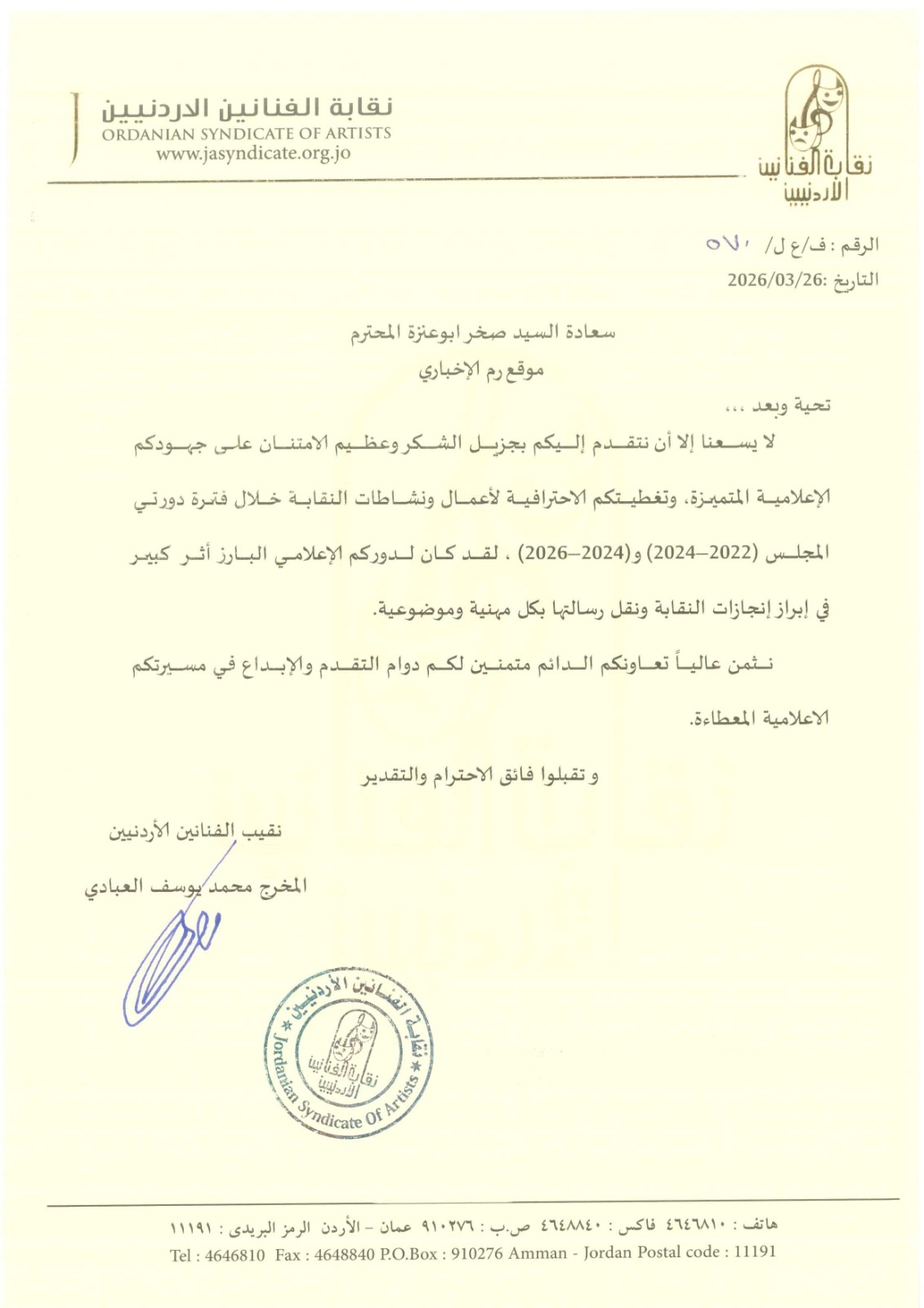 وأعربت النقابة في كتابها عن جزيل الشكر وعظيم الامتنان على الجهود الإعلامية المتميزة، والتنظيم الاحترافي لأعمال ونشاطات النقابة خلال فترة دورتي المجلس (2022–2024) و(2024–2026).