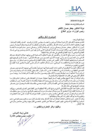 رم - أصدرت جمعية الفنادق الأردنية كتاب شكر وتقدير وعرفان إلى الحكومة الأردنية، تقديراً للجهود المتميزة التي بذلتها في دعم القطاع السياحي، لا سيما القطاع الفندقي، من خلال الحزمة الحكومية الأخيرة التي ركزت على تعزيز الاستقرار التشغيلي وضمان استمرارية المنشآت السياحية في مواجهة التحديات الراهنة.