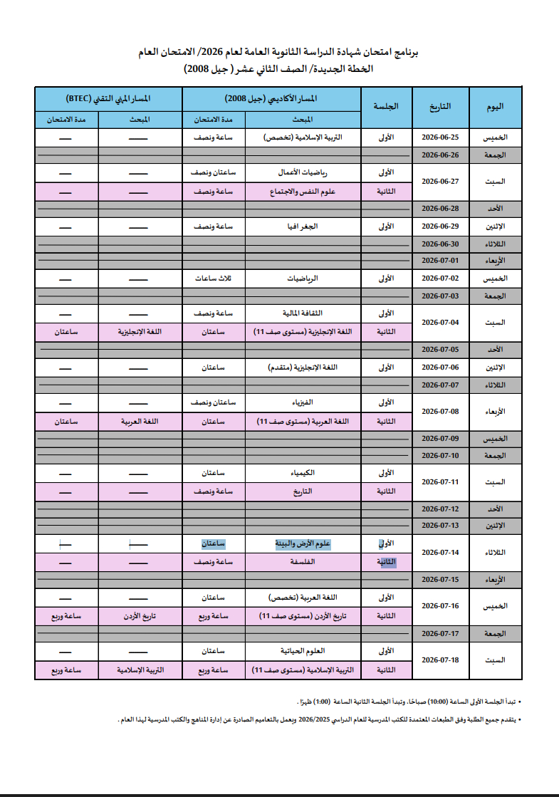 رم - أعلنت وزارة التربية والتعليم الأحد، عن جدول امتحانات شهادة الدراسة الثانوية العامة لعام 2026 لطلبة الصف الثاني عشر.