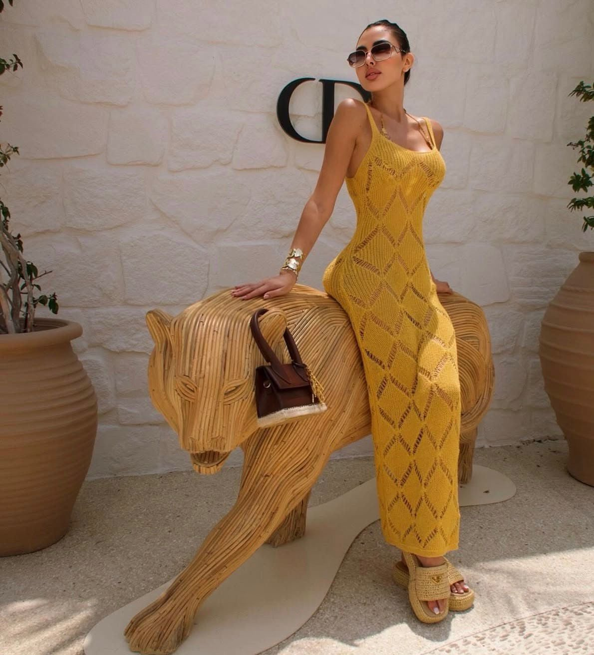 ظهرت مريم حسين بفستان كروشيه طويل باللون الأصفر، ليجسد هذا التصميم أحد أبرز اتجاهات الموسم. الكروشيه يضيف لمسة حِرفية مميزة، فيما يعكس اللون الأصفر إشراقة وحيوية مثالية لأجواء الربيع والصيف.