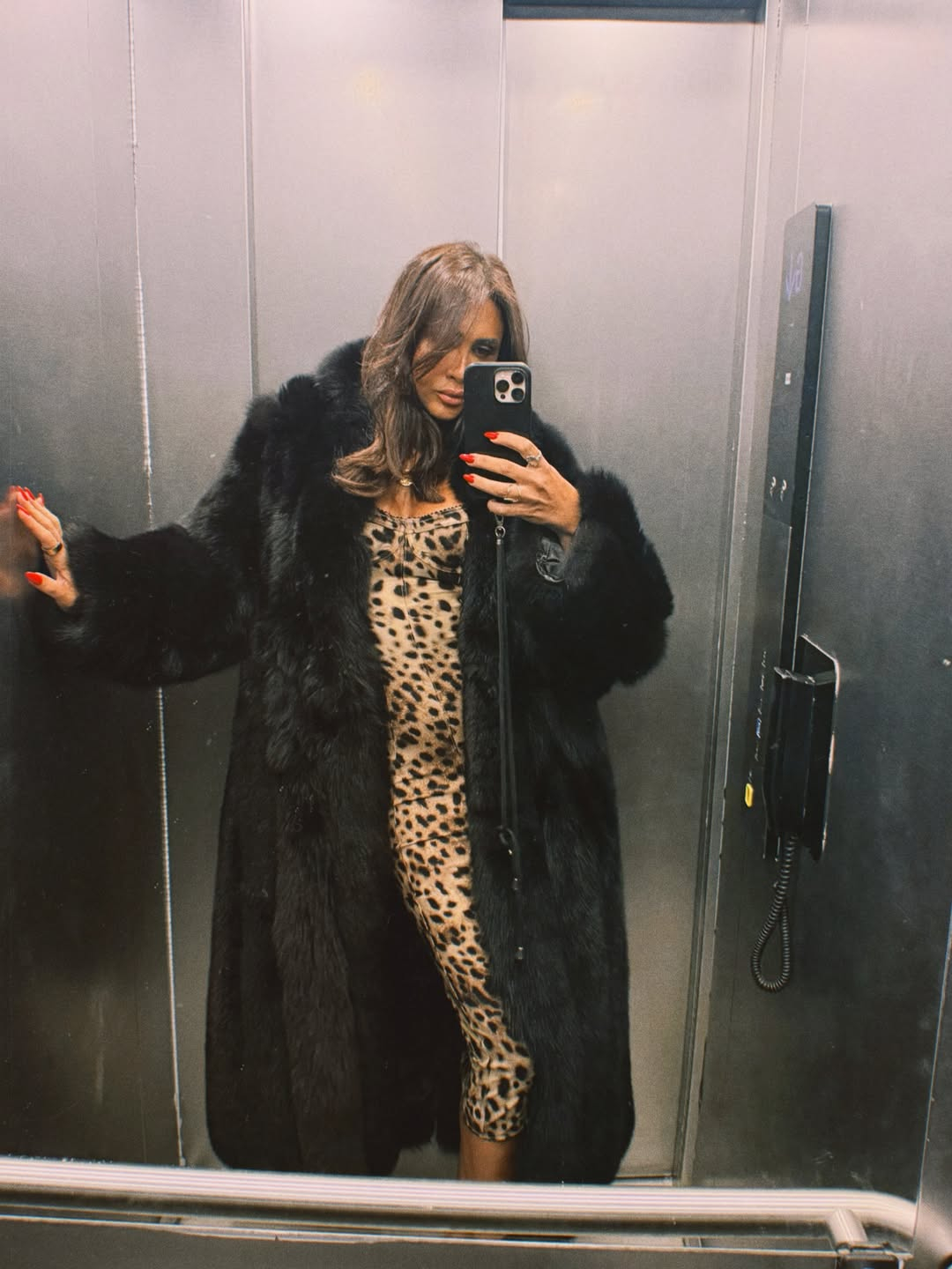 تألقت أنجي في إطلالة ناعمة بفستان ميدي أنيق بنقشة الفهد الناعمة باللونين البيج والأسود، بتصميم مجسم مع قصّة بارزة عند منطقة الصدر، ونسّقت مع الفستان معطفاً طويلاً وضخماً من الفرو باللون الأسود. وأكملت إطلالتها الأنيقة بمجوهرات ذهبية رقيقة أضافت المزيد من الفخامة الى طلّتها الشتوية.