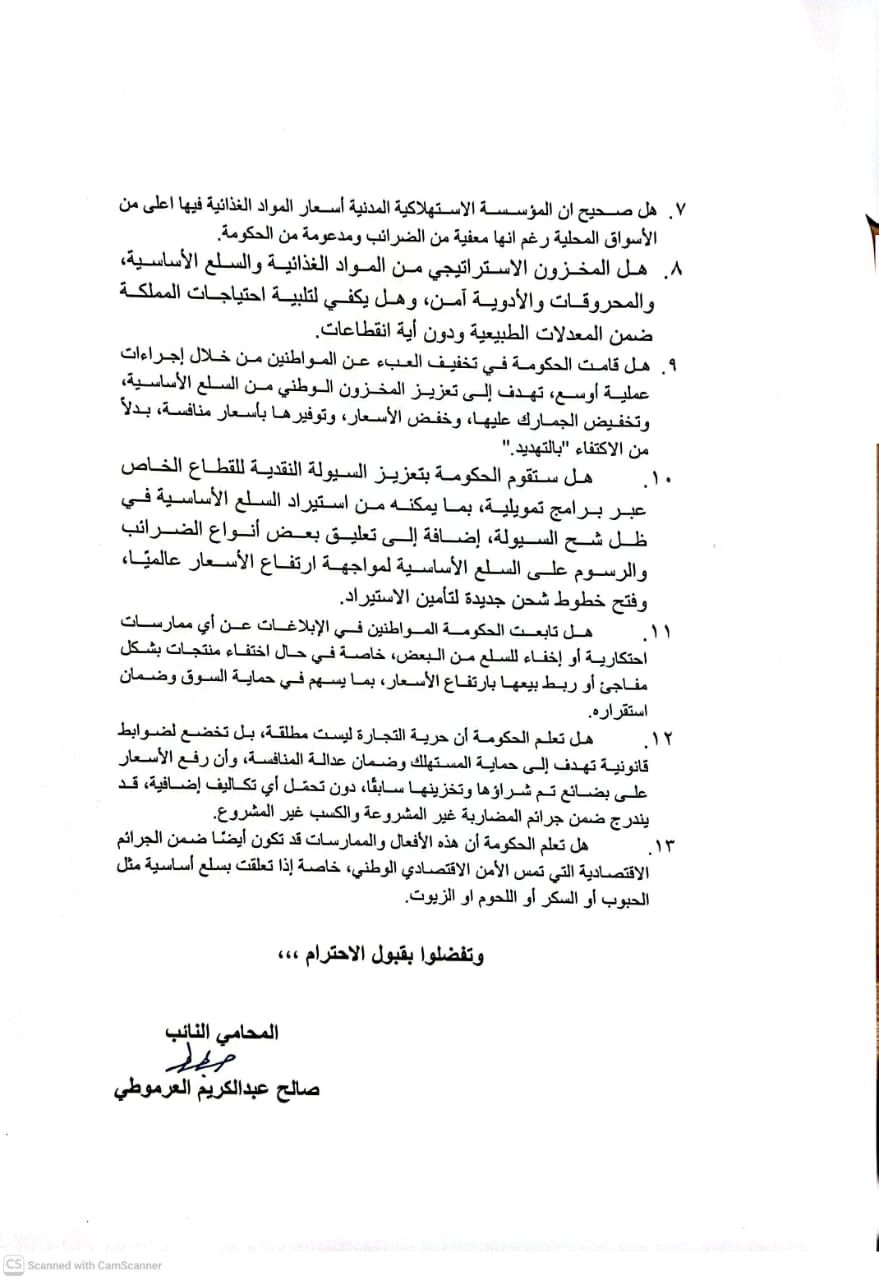 9. هل قامت الحكومة في تخفيف العبء عن المواطنين من خلال إجراءات عملية أوسع، تهدف إلى تعزيز المخزون الوطني من السلع الأساسية، وتخفيض الجمارك عليها، وخفض الأسعار، وتوفيرها بأسعار منافسة، بدلاً من الاكتفاء "بالتهديد".