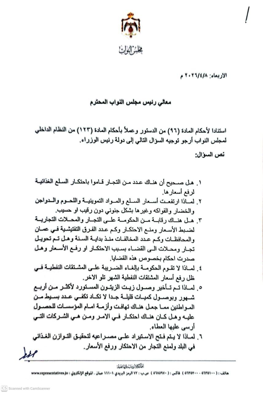 رم - وجه رئيس كتلة الإصلاح النيابية النائب صالح العرموطي سؤالًا نيابي إلى رئيس الوزراء الدكتور حعفر حسان، حول احتكار السلع وارتفاع اسعارها، بالإضافة الى الرقابة الحكومية على التجار والمحال التجارية.