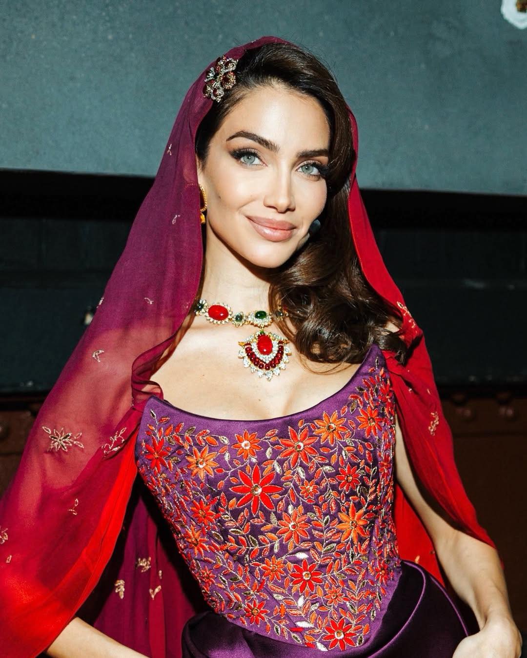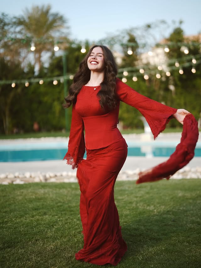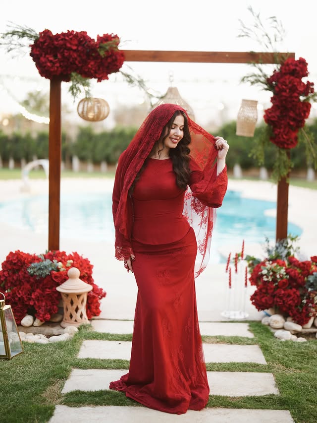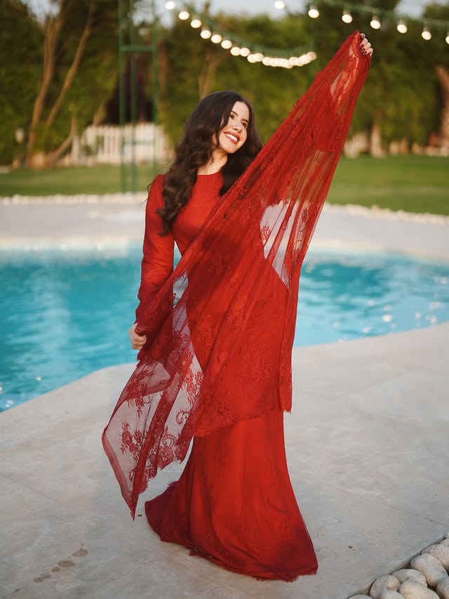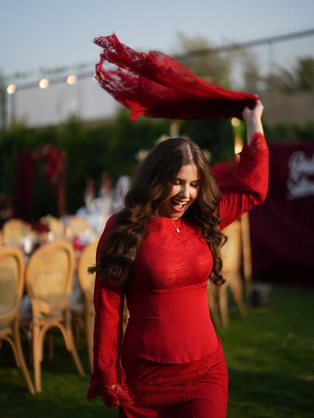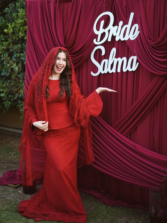 اختارت سلمى ثوبًا أحمر لافتًا للحفل، أبرز قوامَها الرشيق، ونسقت معه غطاء رأس من الدانتيل، كما اعتمدت تسريحة شعر منسدلة ومموجة، أضفت لمسة جذابة للإطلالة.