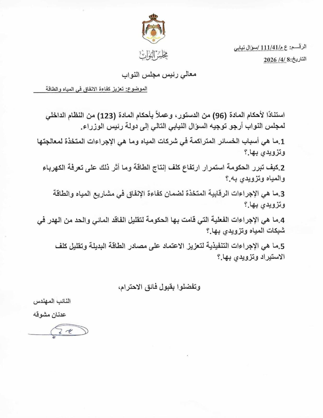 رم - وجه النائب المهندس عدنان مشوقة، سؤال نيابي يطالب الحكومة ببيان أسباب خسائر شركات المياه وبيان ارتفاع كلف الطاقة على جيب المواطن، وتعزيز كفاءة الانفاق في المياه والطاقة.