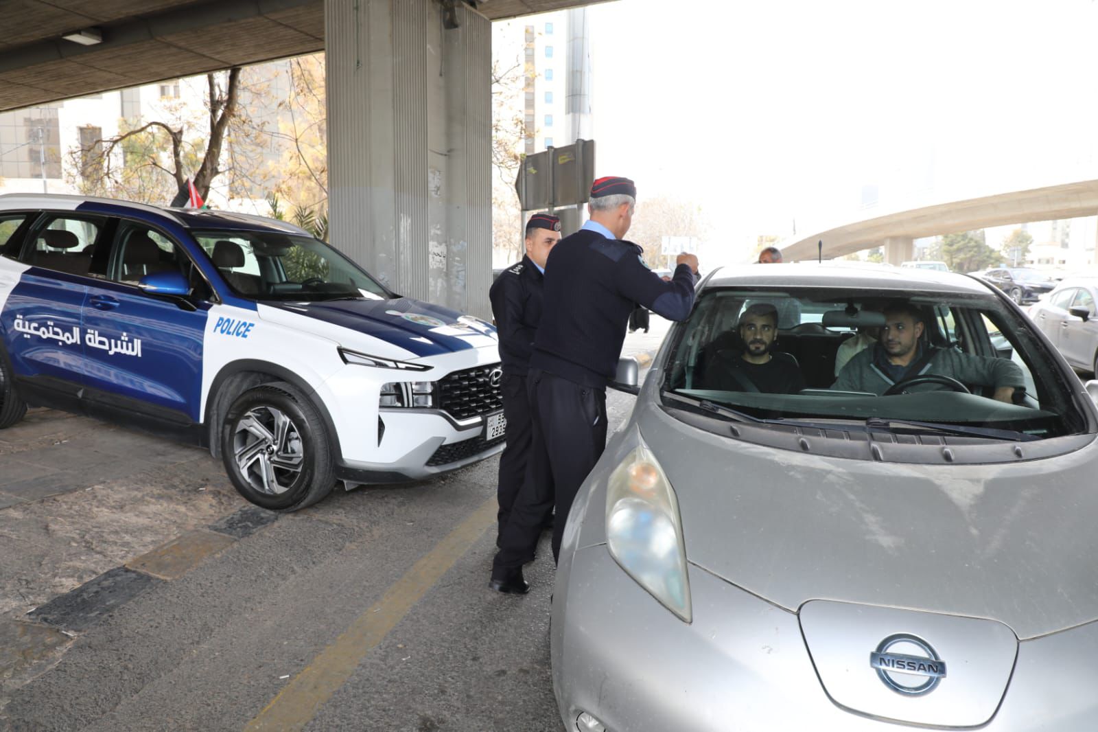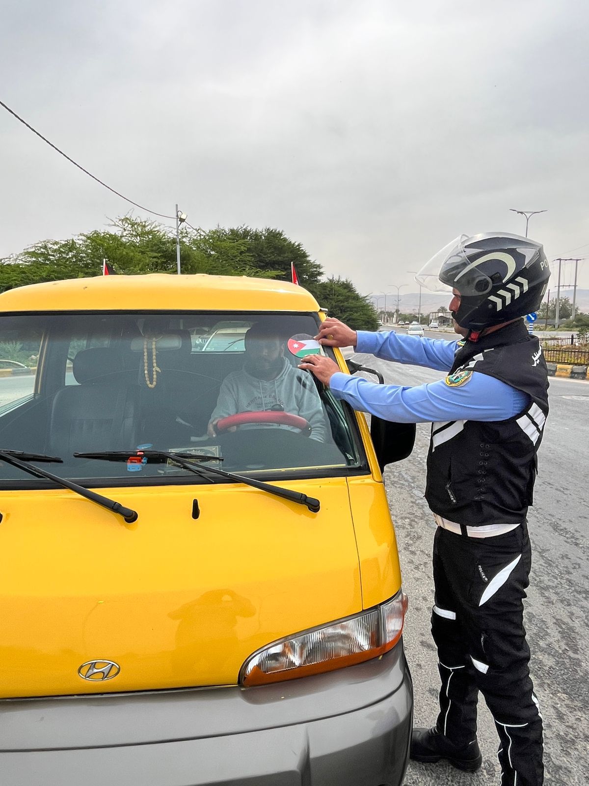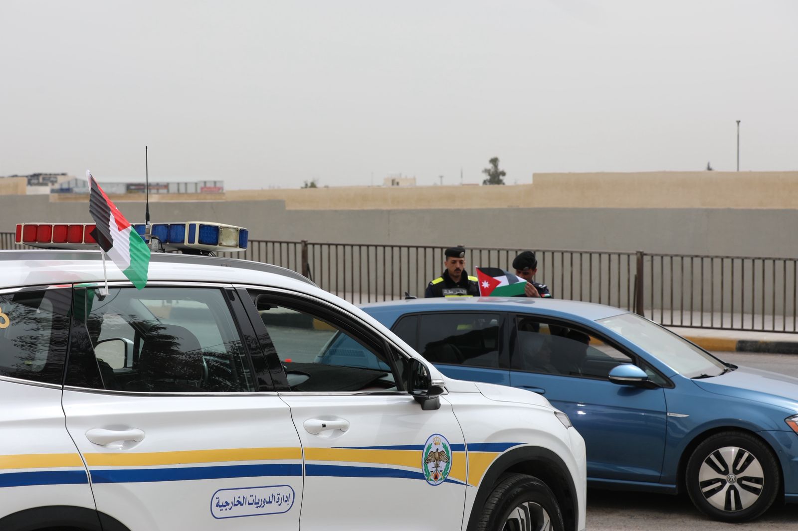 الأمن العام يقوم بلصق وتوزيع العلم الأردني على مركبات المواطنين