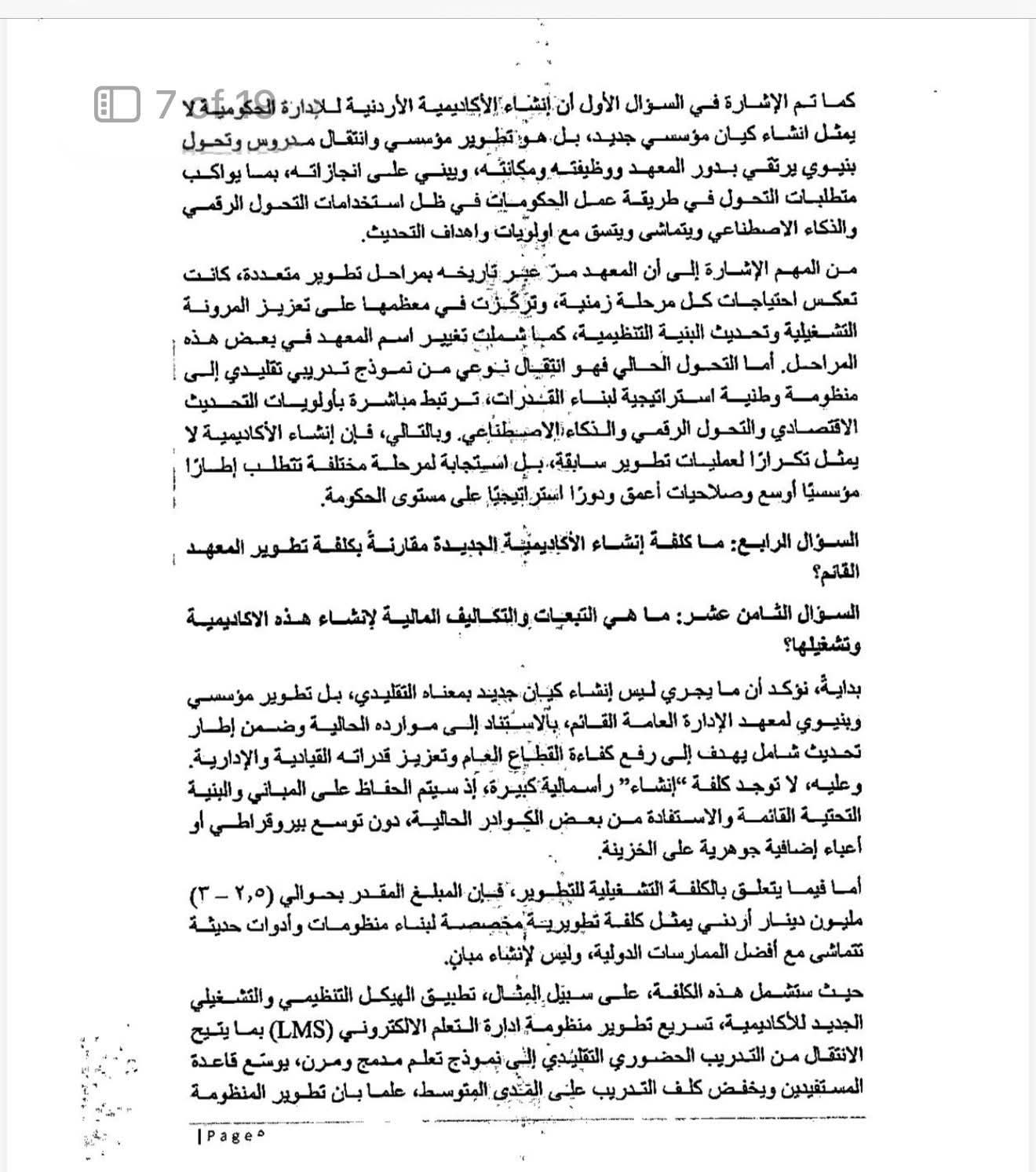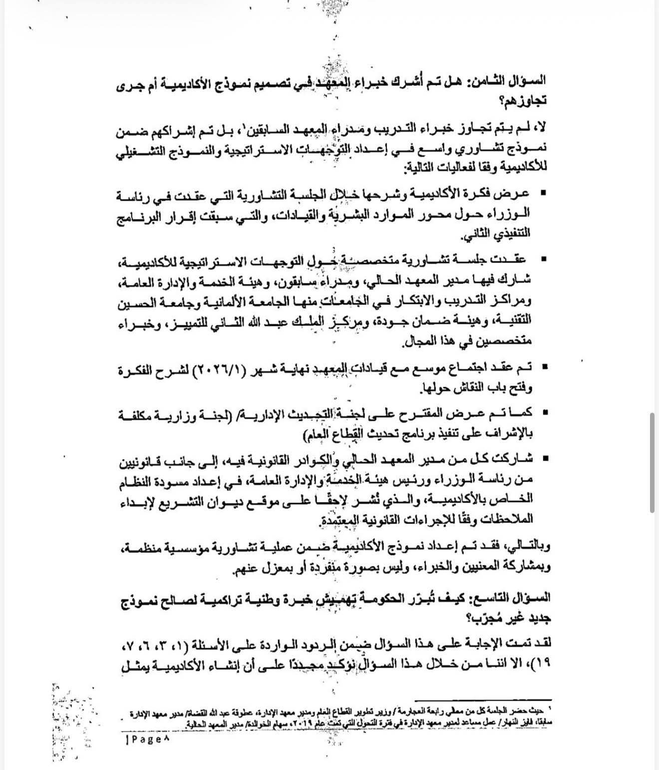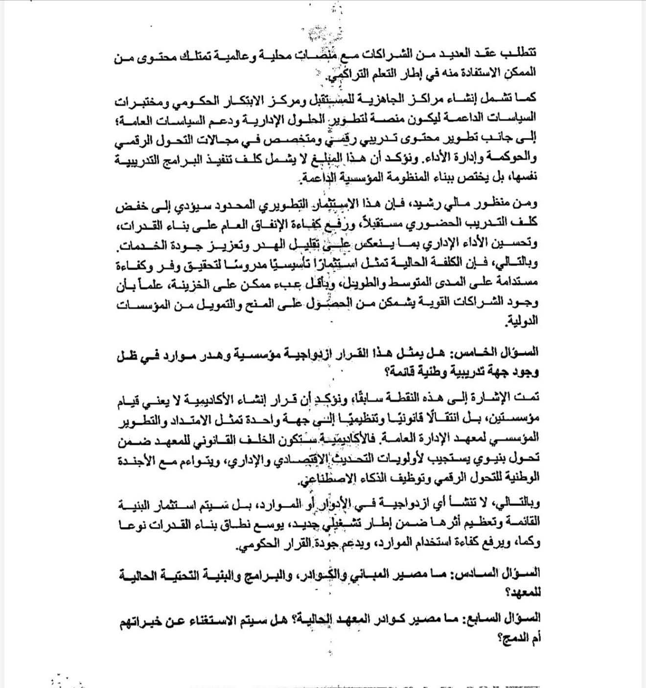 ١٩. هل تعترف الحكومة بأن إنشاء الأكاديمية بصيغتها الحالية يعني فعليا إلغاء دور معهد الإدارة العامة تدريجيا؟