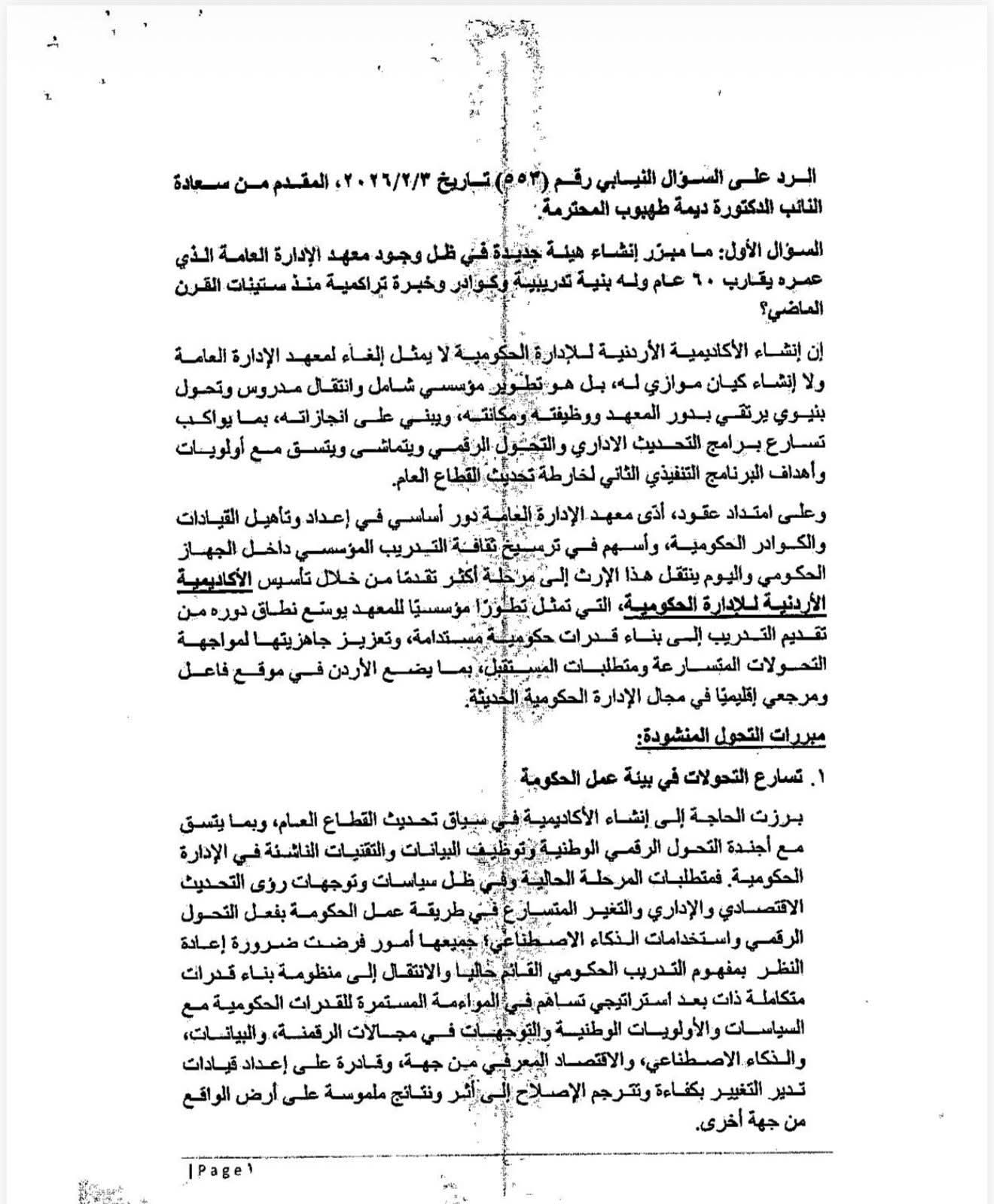 رم - قالت النائب د ديمة طهبوب انها لا تجد للآن لوزارة تطوير القطاع العام من اسمها نصيب من أول نظام الموارد البشرية الذي يصلها عليه يوميا شكاوى وتظلمات واستدعاءات من المواطنين المقيمين والمغتربين الى آخر تقليعة في اصطناع هيئة جديدة تحت مسمى الأكاديمية الأردنية للإدارة الحكومية التي توازي فكرتها معهدا ذا تاريخ وامتداد في الأردن منذ عام ١٩٦٨ هو معهد الإدارة العامة الذي كان من أول المعاهد في المنطقة العربية والشرق الأوسط التي تُعنى بالتدريب وبناء القدرات وإجراء الدراسات والبحوث وتقديم الاستشارات في مختلف مجالات الإدارة العامة.
