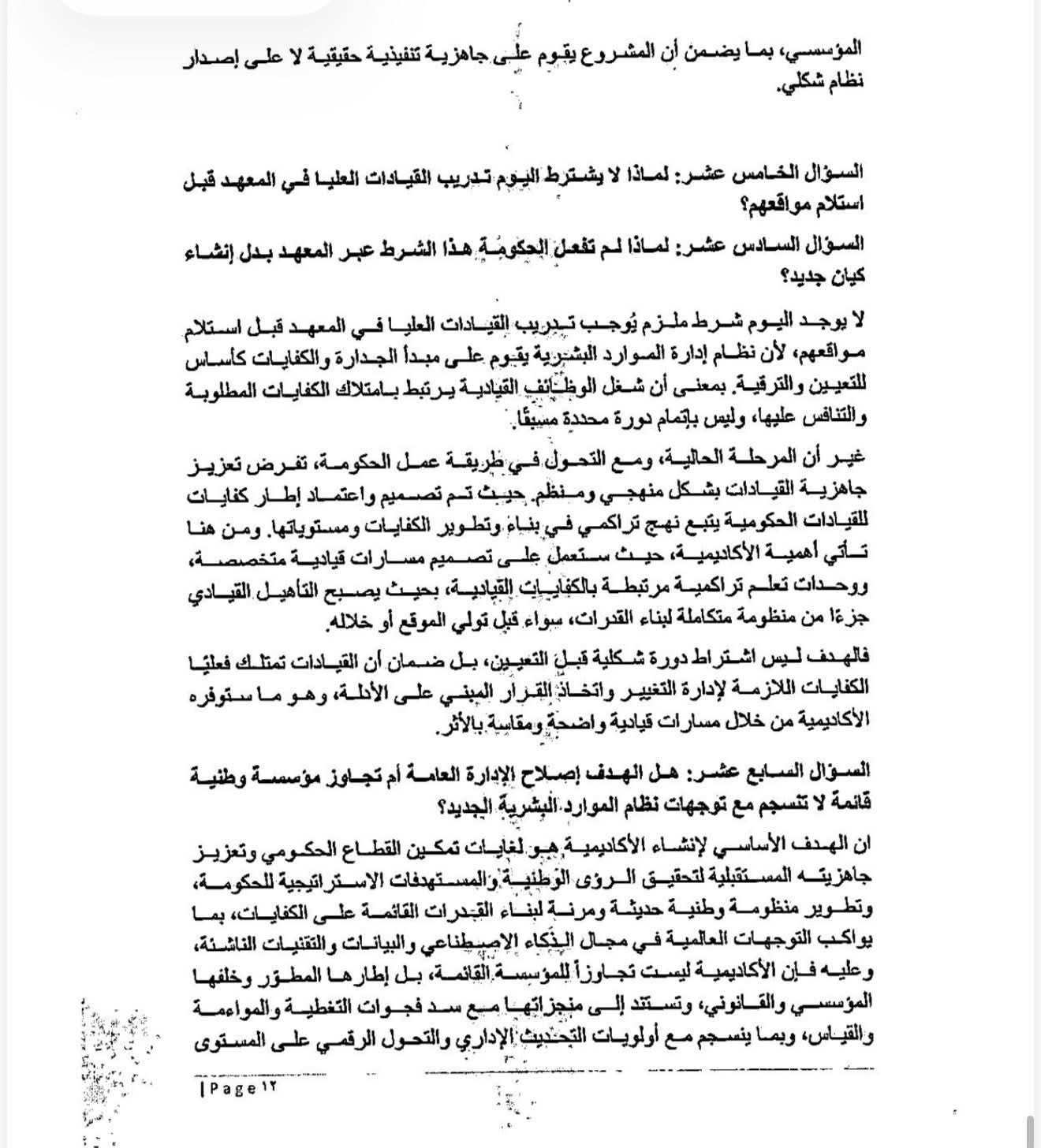 ١٢. هل سترتبط الأكاديمية برئيس الوزراء كما كان المعهد سابقا؟ أم ستكون جهة شكلية دون مظلة سيادية؟