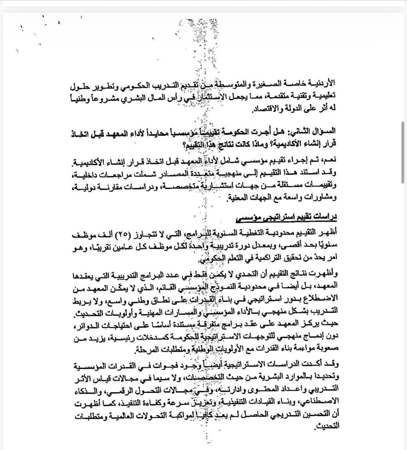 ٢. هل أجرت الحكومة تقييماً مؤسسياً محايداً لأداء المعهد قبل اتخاذ قرار إنشاء الأكاديمية؟ وماذا كانت نتائج هذا التقييم؟
