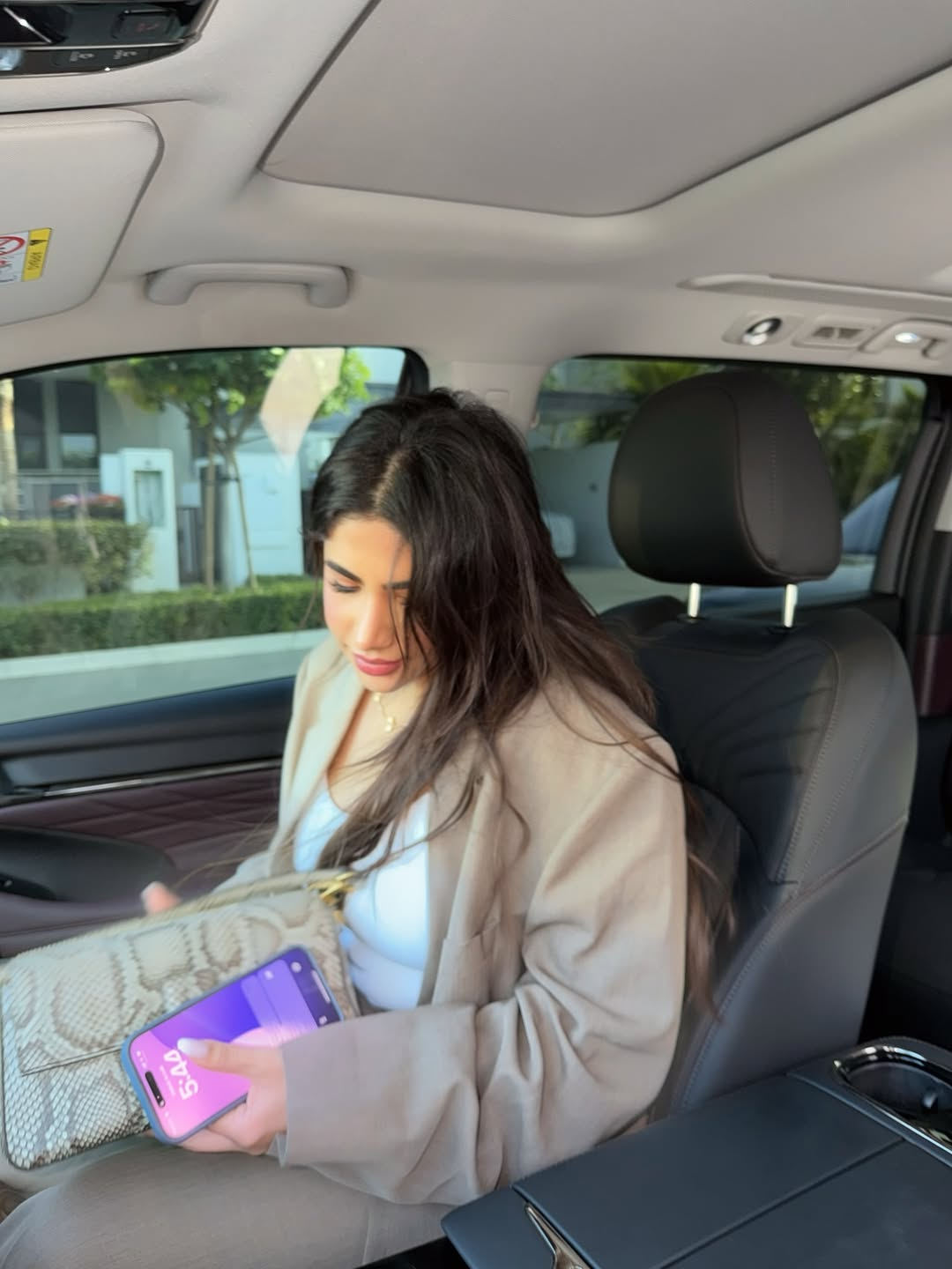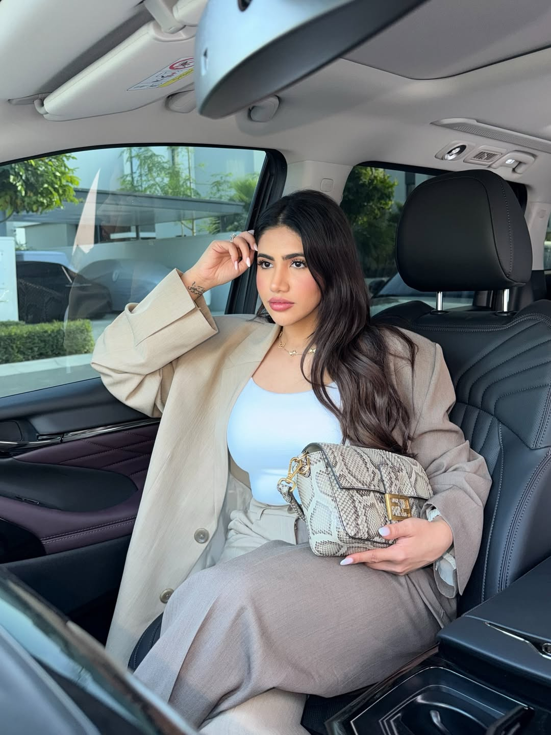 ارتدت بدلة فضفاضة بالستايل الواسع، جاءت باللون البيج ونسقت معها توب باللون الأبيض، و أكملت اللوك بحقيبة متوسطة الحجم بنقشة جلد الثعبان.