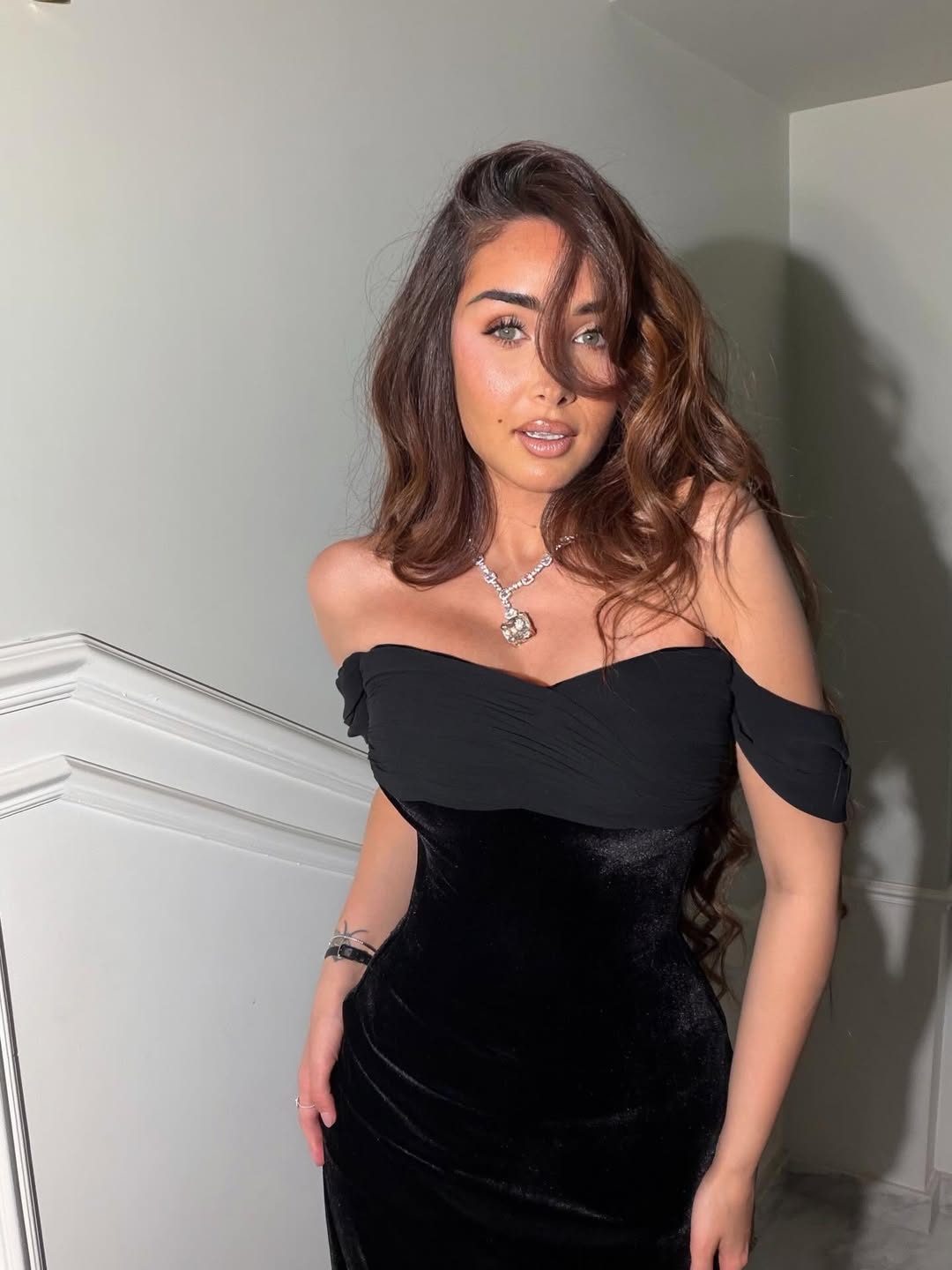 ولإتمام لوحتها الجمالية، زينت هنا عنقها بعقد ماسي فاخر، واعتمدت تسريحة شعر مموج مع مكياج دافئ بألوان ترابية، ما منحها إطلالة متكاملة تجمع بين الرقي والبساطة.