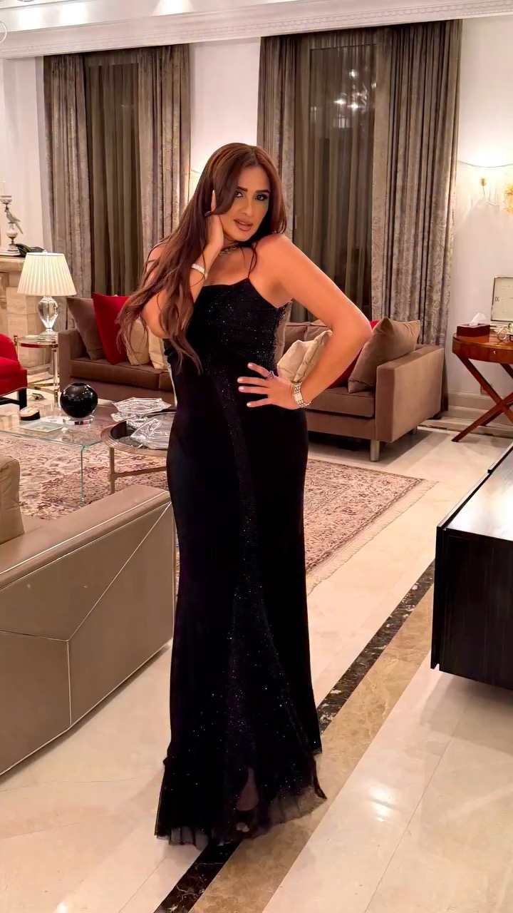 رم - اعتمدت النجمة #ياسمين_عبد_العزيز فستاناً جذاباً باللون الأسود اللامع في حضورها حفل زفاف ابنة المنتج المصري محمد السعدي.