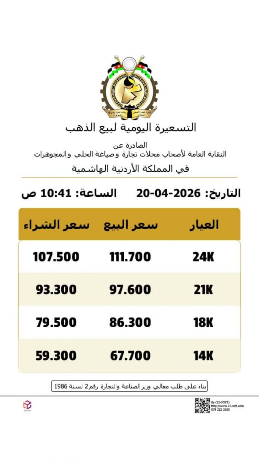 فيما بلغ سعر الغرام الواحد من الذهب عيارات 24 و18 و14 لغايات البيع من محالّ الصاغة 111.70 دنانير و86.30 دينار 67.7 دينار على التوالي.
