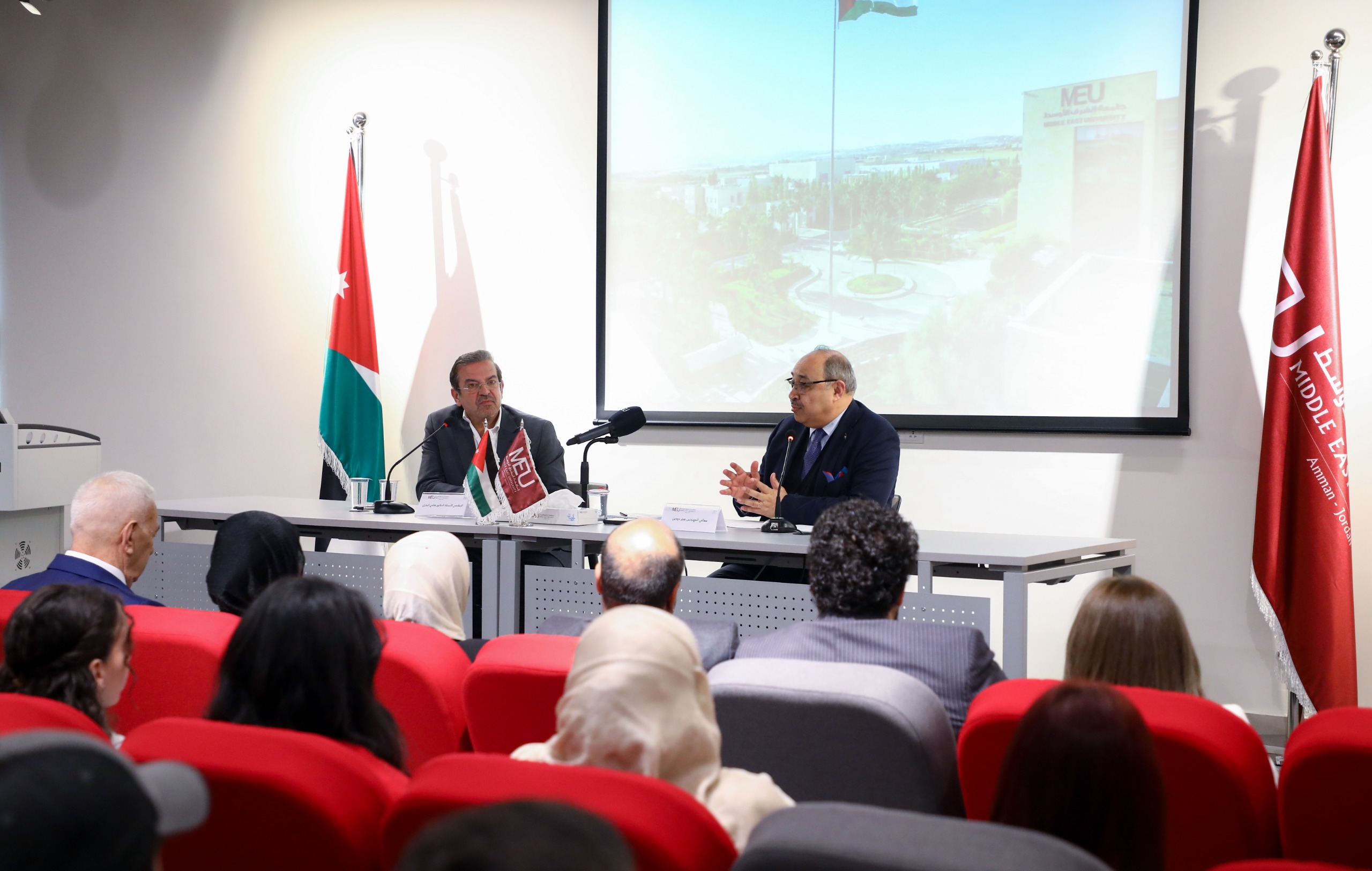 رم - نظّمت كلية الإعلام في جامعة الشرق الأوسط لقاءً حواريًا استضافت خلاله وزير الإعلام الأسبق معالي الدكتور صخر دودين، بحضور رئيس مجلس الأمناء سعادة الدكتور يعقوب ناصر الدين، وعميد الكلية الدكتور رامز أبو حصيرة، والنائب الأستاذة الدكتورة تمارا ناصر الدين، وأعضاء الهيئتين التدريسية والإدارية وجمع من الطلبة.