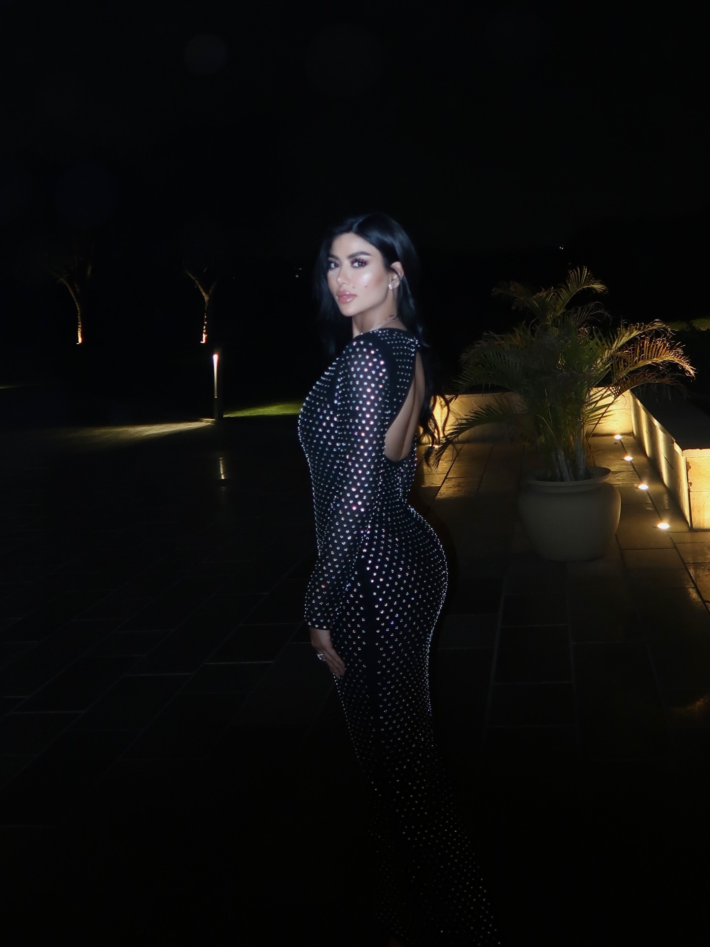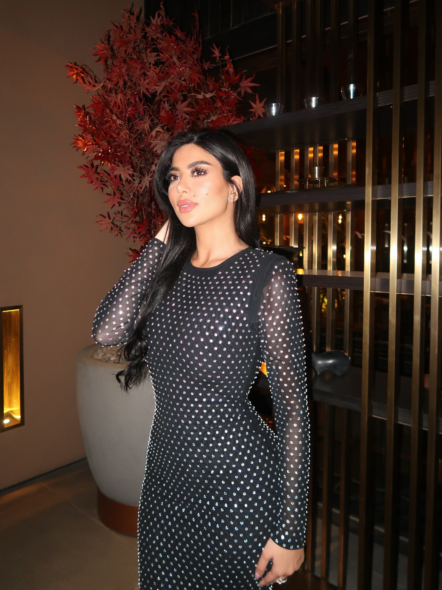 وجاء التصميم بقصة ضيقة وأكمام طويلة شفافة؛ ما منح الإطلالة طابع عصري جذاب، مع إبراز القوام بأسلوب أنثوي ناعم.