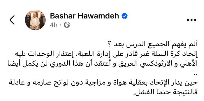 بشار الحوامدة: إدارة بعقلية هواة .. والدوري مهدد بعدم الاستكمال