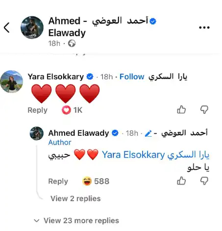 والتفاعل لم يتوقف عند هذا الحد، بل امتد إلى التعليقات، حيث أبدت يارا إعجابها بالصورة من خلال رموز القلوب، ليرد العوضي بطريقة ودودة قائلاً: "حبيبي يا حلو".