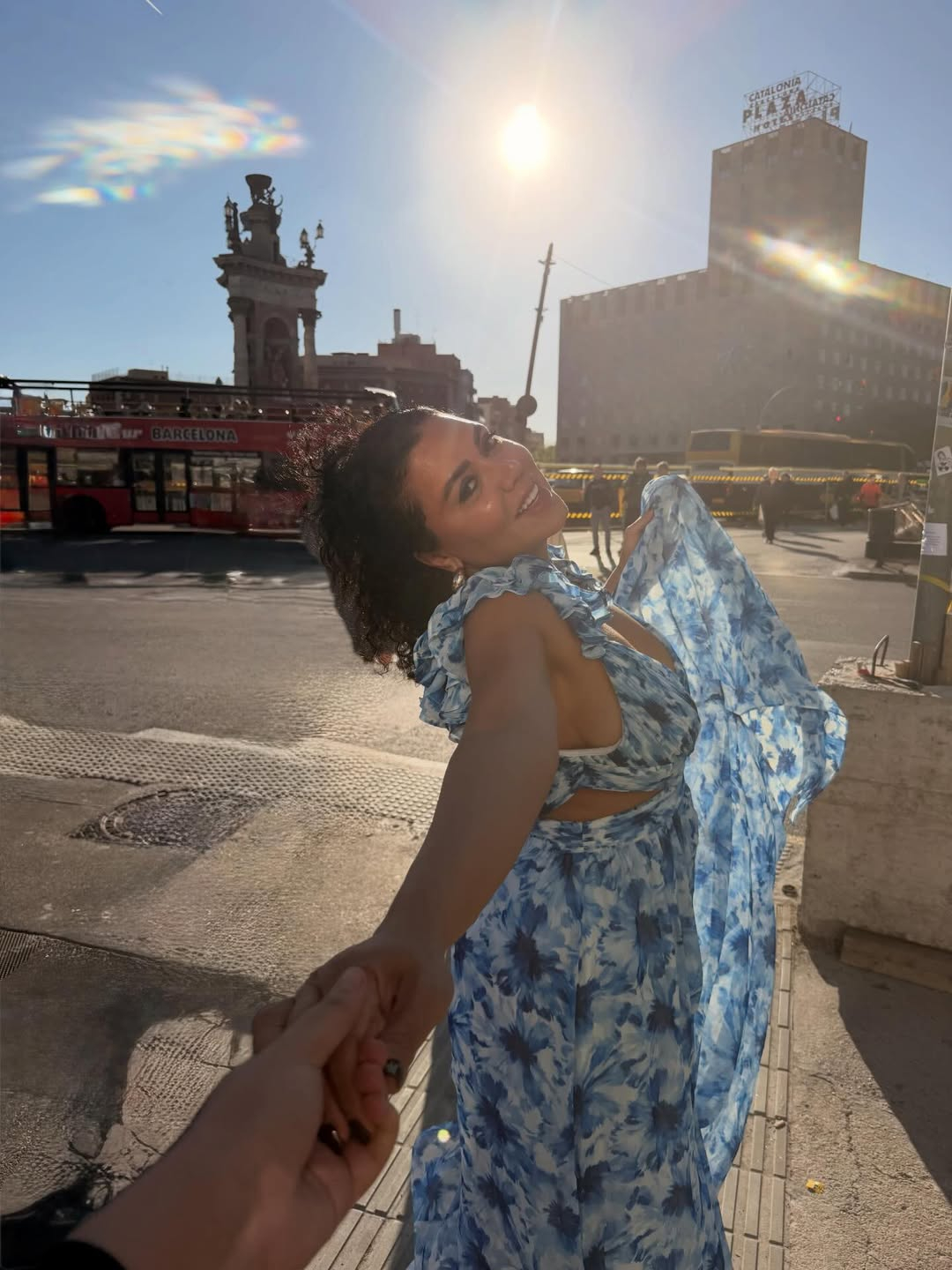 اعتمدت يوسف على قماش الشيفون الخفيف والمنسدل، المثالي لأجواء الصيف الحارة. النقشة جاءت بدرجات الأزرق والأبيض بأسلوب *Watercolor Floral Print* أو "الألوان المائية"، وهي موضة رائجة بقوة في صيف 2026، توحي بالانتعاش وتناسب أجواء المدن الساحلية مثل برشلونة.
