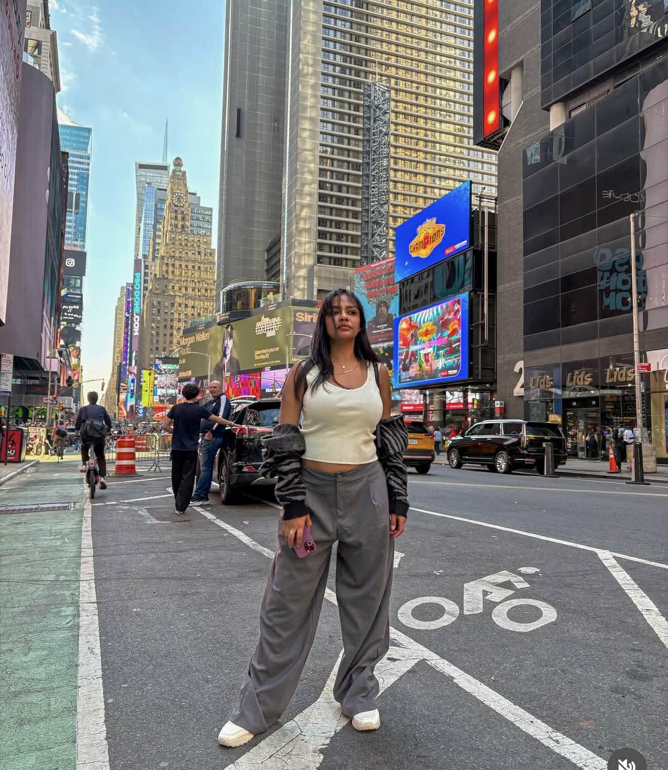 وتالقت اسماء ابو اليزيد، فى الصور باطلالة ملفتة مرتدية ملابس كاجوال توب ابيض مكشوف البطن و بنطلون واسع باللون الرمادى.