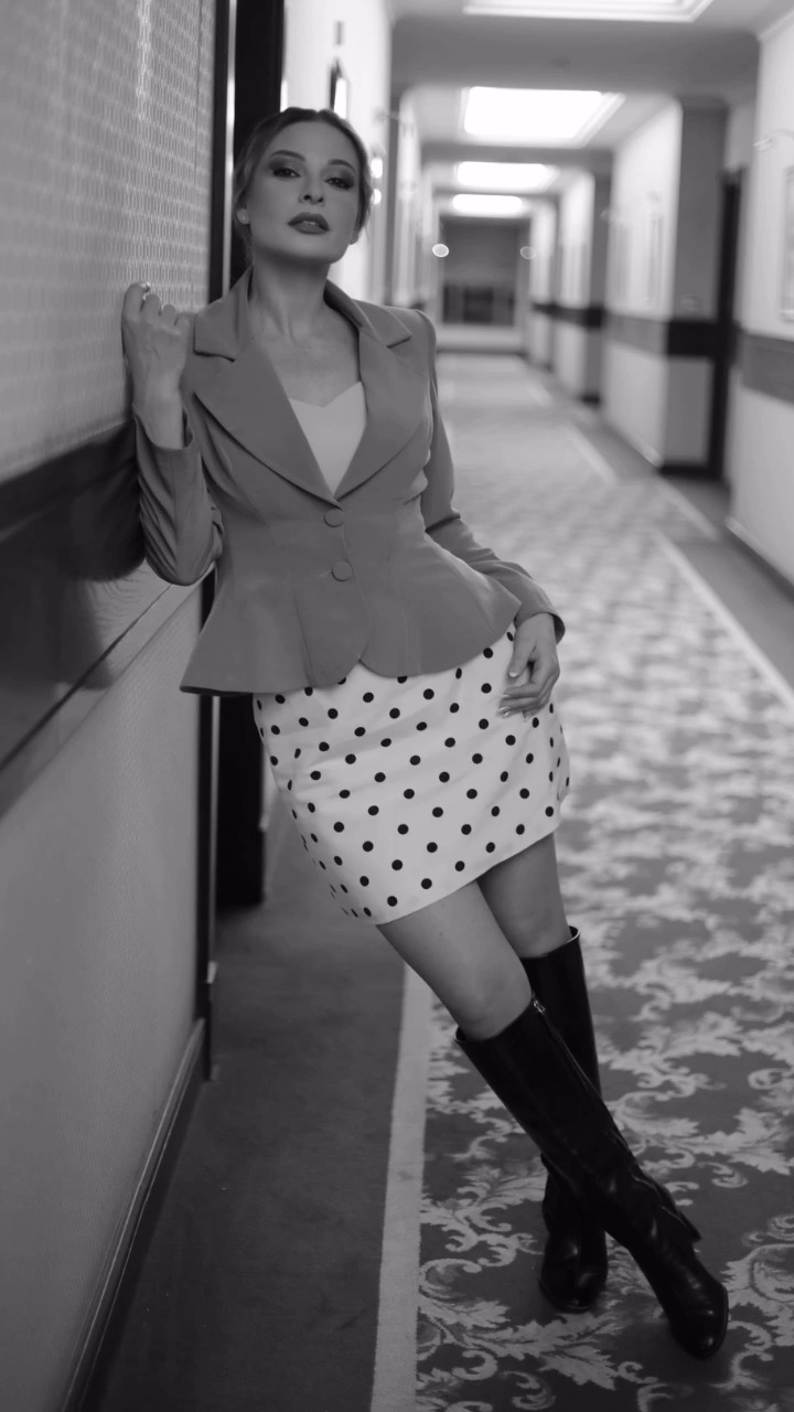 ارتدت باميلا لوكا كلاسيكيا تكون من تنورة قصيرة باللون الأبيض والأسود بصيحة البولكا دوت ونسقت معها بليزرا باللون الكشمير.