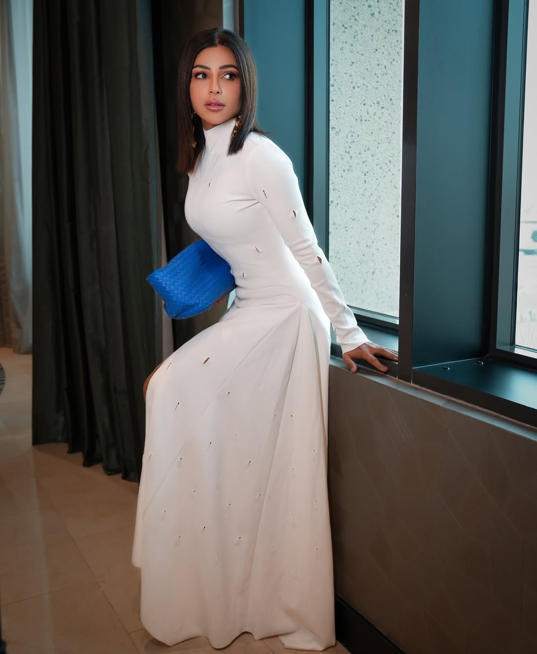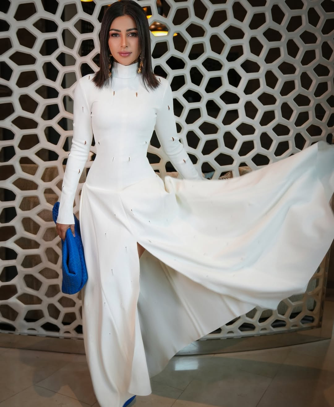 اختارت فستانًا بأكمام طويلة وبصيحة السليت، مزينًا بشقوق صغيرة في كامل التصميم، ونسّقته مع حذاء بكعب عالٍ باللون الأزرق، مع حقيبة متوسطة الحجم باللون ذاته.