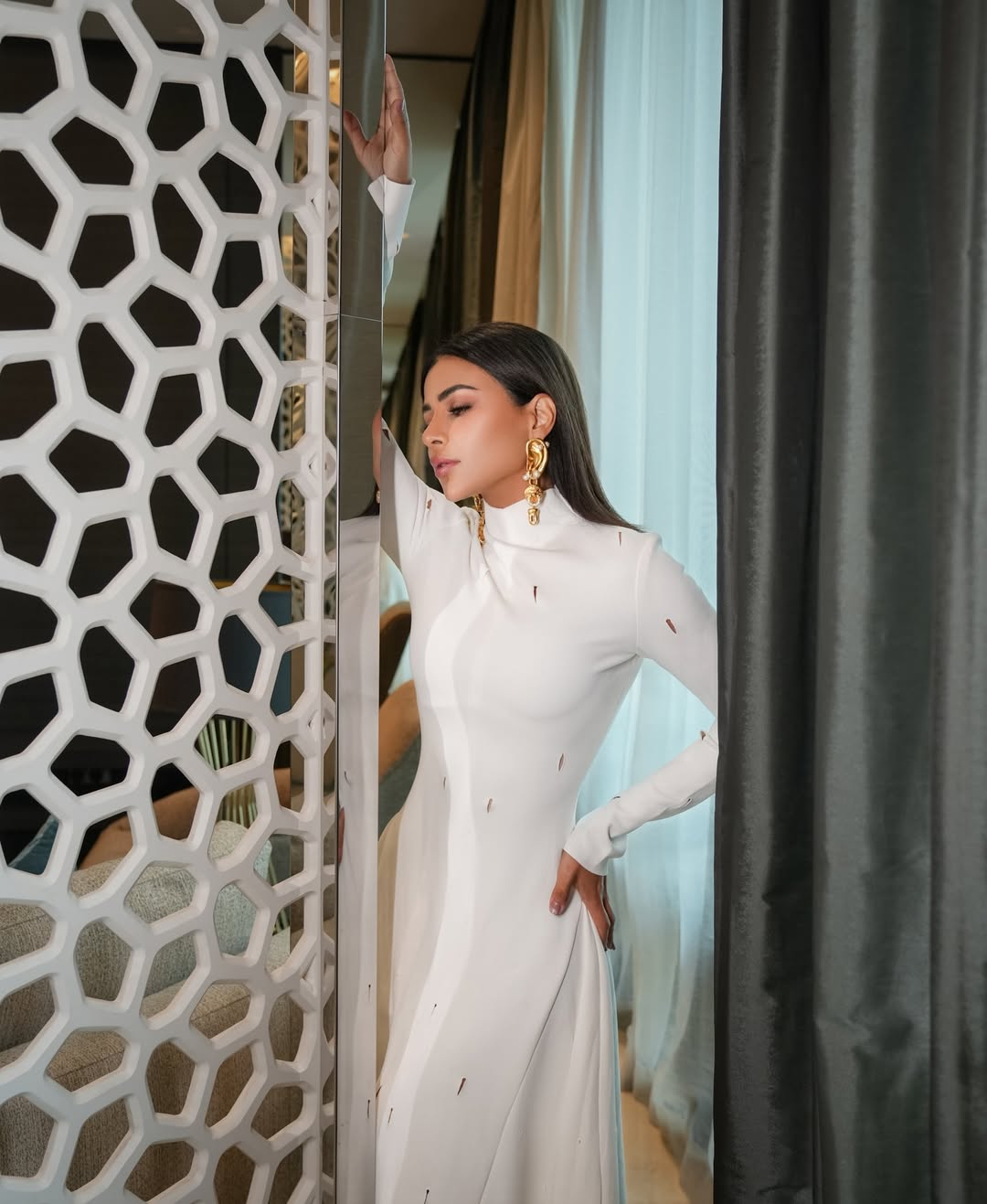 أكملت الإطلالة بقرط طويل باللون الذهبي، واعتمدت تسريحة الشعر المنسدل.