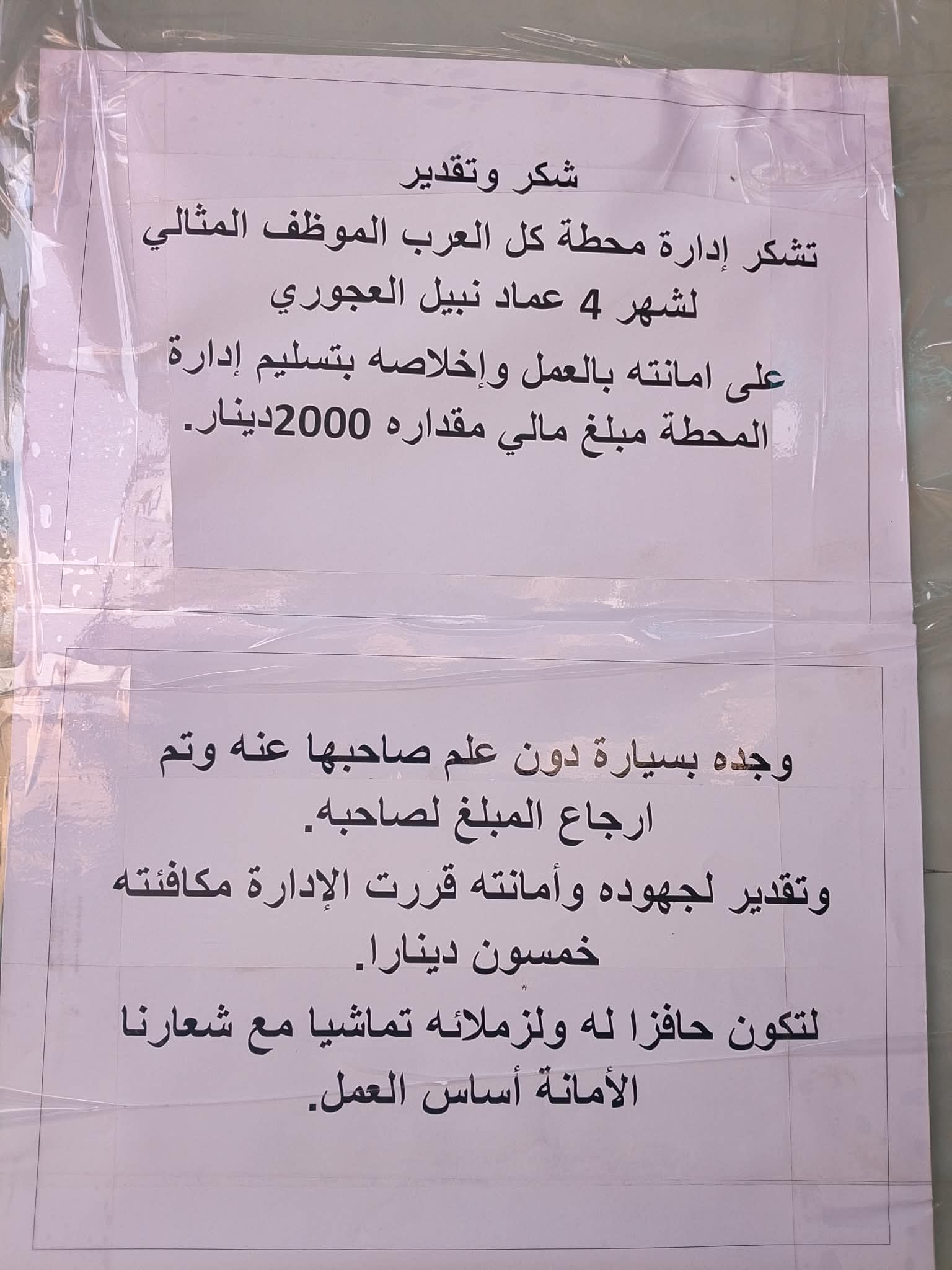 وعلى امانة هذا الموظف تم منحه شهادة تقدير وشكر على امانته وصدقه مؤكدا ان المبلغ لايعلم صاحب المركبه عن وجودها.
