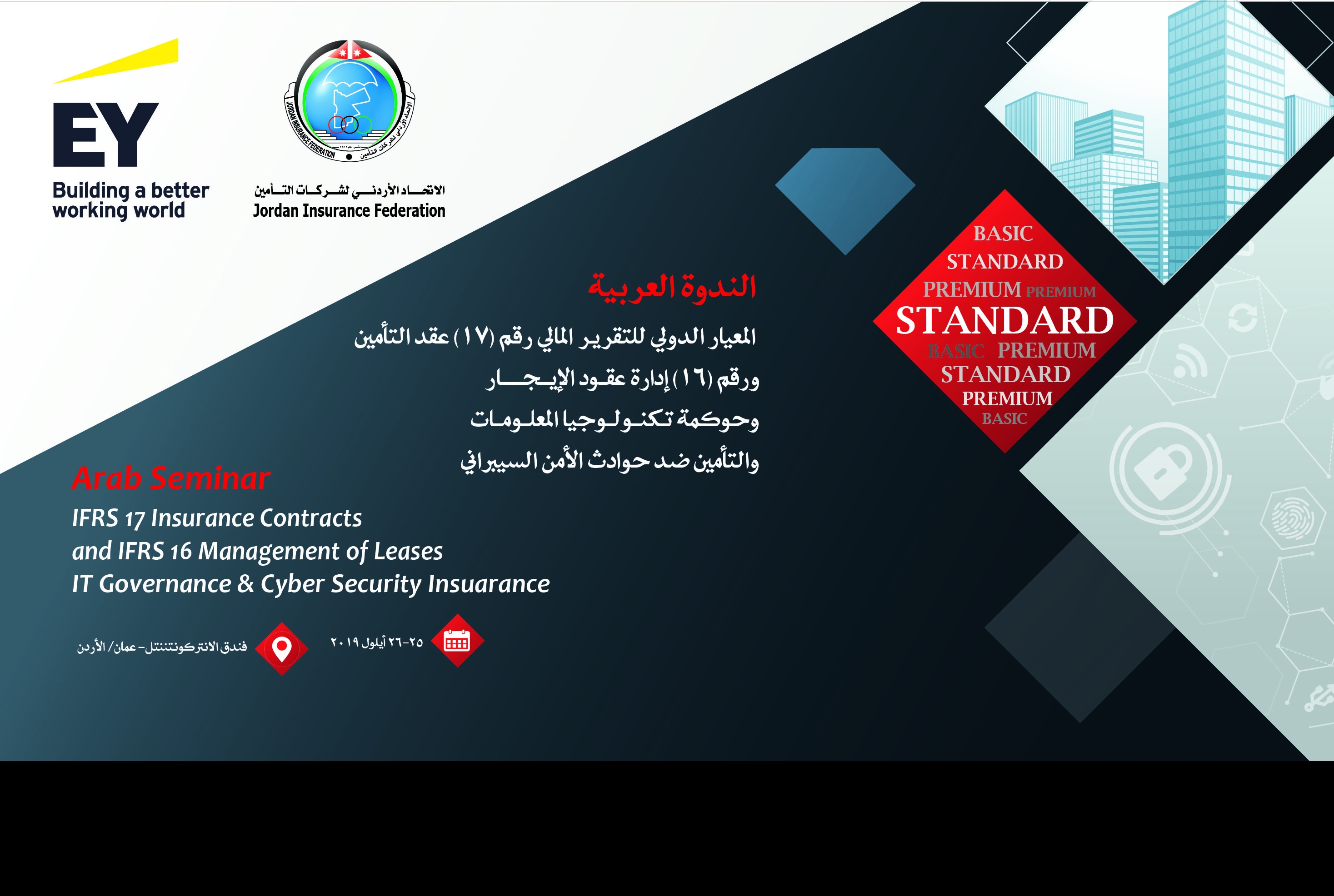 تحت رعاية معالي وزير الصناعة والتجارة والتموين الدكتور طارق حموري، يقيم الاتحاد الاردني لشركات التأمين وبالتعاون مع شركة إرنست ويونغ- الأردن ندوة عربية بعنوان "المعيار الدولي للتقرير المالي رقم (17) عقد التأمين ورقم (16) إدارة عقود الإيجار وحوكمة تكنولوجيا المعلومات والتأمين ضد حوادث الأمن السيبراني" وذلك يومـي الأربعــاء والخميس 25-26/9/2019 في فندق انتركونتننتال- عمان- الأردن.